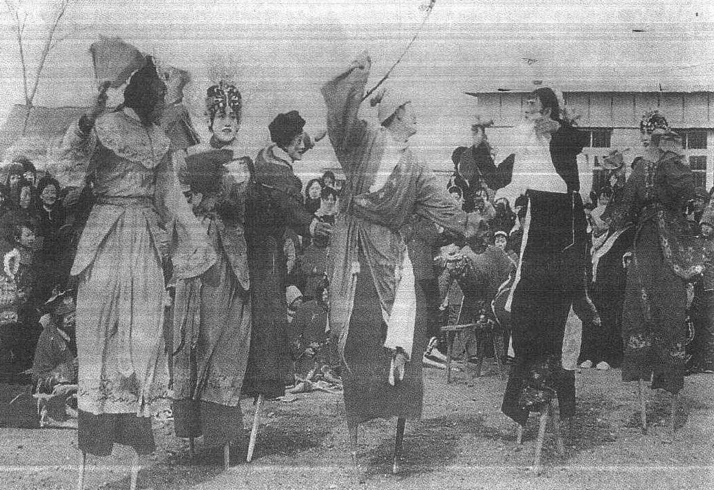 | 释义 | 辽南高跷秧歌 146 辽南高跷秧歌流行于辽宁南部营口、盖县、海城、大石桥等地。是东北地区诸秧歌中,规模最大、最具代表性的一种。踩高跷表演是它最显著的特点。表演程序是: 1. 开场 (搭象; 搭叠罗汉)。2. 跑大场 (混场)。花形图案有:“龙摆尾”、“穿十字梅”、“挂斗”、“走浪头”等。3.清场(压鼓一对表演小场和头跷表演备马、鞭挂等)。4. 小戏:如“小放牛”、“杀江”、“断桥”等。高跷秧歌的人物安排是:头跷(武丑),二跷(武旦),渔翁 (老生), 老(彩旦),渔、樵、耕、读、许仙、 白、青蛇、傻公子及一般上、下装 (上装为女角,下装为男角)。高跷秧歌是通过走相、稳相和鼓相及各种手巾花的表演变化体现其风格特点的,当地概括为“稳中浪”。伴奏乐器是唢呐和打击乐。典型曲牌有:《句句双》、《柳青娘》、《大姑娘美》、《五匹马》等。 ☚ 出子秧歌 上装 ☛ 辽南高跷秧歌 辽南高跷秧歌辽南高跷秧歌是流传在辽宁省的有代表性的民间舞蹈。当地百姓中有 “喇叭一响,浑身发痒; 锣鼓一敲,乐得蹦高” 的民谣,形象地反映了人们对它的钟爱之情。
