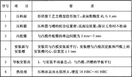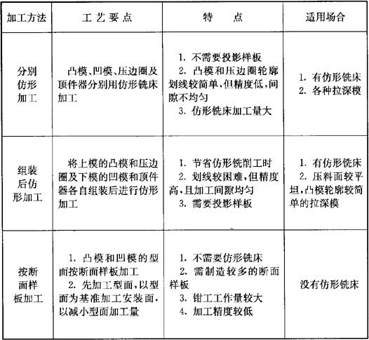 (2)大型覆盖件拉深模的加工方法 制造方法应根据冲槽的形状、结构及加工设备选择,常用的加工方法见表5.7-17。 表5.7-17 大型覆盖件拉深模常用加工方法