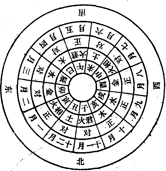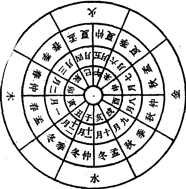 六十年中,由阴阳干支配合的甲子来推衍,凡五运六气的太过不及,均可推算而得。甲子的天干,主要是主五运的盛衰;甲子的地支,主要司六气的变化。所以讲求五运六气,必不能离开干支甲子。 五运 即以木、火、土、金、水五行之气来概括一年五个季节气象变化规律的总称。《素问·天元纪大论》说;“五运阴阳者,天地之道也。”道,就是运行变化的规律。五行之所以化为五运,虽是由于十天干的推衍而得,但它毕竟不同于五行的分属。《五运行大论》说: “土主甲己,金主乙庚,水主丙辛,木主丁壬,火主戊癸”。这与十干主五行不相同。甲为木行的阳干,己为土行的阴干,甲己相合,化为五行的土运。乙为木行的阴干,庚为金行的阳干,乙庚相合,化为五运的金运。丙为火行的阳干,辛为金行的阴干,丙辛相合,化为五运的水运。丁为火行的阴干,壬为水行的阳干,丁壬相合化为五运的木运。戊为土行的阳干,癸为水行的阴干,戊癸相合,化为五运的火运。从这甲己土运,乙庚金运,丙辛水运,丁壬木运,戊癸火运的次序来看,仍然是土生金、金生水、水生木、木生火五行相生的次序。而化运的十天干不同于分属五行的十天干相配,其根本是五行十天干的分属是以五方、五季的关系来确定的,因为甲乙是东方和春季的两干,故分属于木; 丙丁是南方和夏季的两干,故分属于火; 戊己是中央和长夏的两干,故分属于土; 庚辛是西方和秋季的两干,故分属于金; 壬癸是北方和冬季的两干,故分属于水。至于十天干化为五运,则是从每一年的第一个月“月建”的“寅”位上化生的。例如: 凡是逢甲逢己的十二年,第一月的月建都是“丙寅”,丙为南方火,丙火生土,故甲己化为土运。凡是逢乙逢庚的十二年,第一月的月建都是“戊寅”,戊为中央土,戊土生金,故乙庚化为金运。凡是逢丙逢辛的十二年,第一个月的月建都是“庚寅”,庚是西方金,庚金生水,故丙辛化为水运。凡是逢戊逢癸的十二年,第一个月的月建都是“甲寅”,甲为东方木,甲木生火,故戊癸化为火运。凡是逢丁逢壬的十二年,第一个月的月建都是“壬寅”,壬为北方水,壬水生木,故丁壬化为水运。以上丙寅、戊寅、庚寅、甲寅、壬寅,都是阳干在寅上,阳主化气,寅为万物的始生,所以一干一支相加,五运即由之而化生。由十干化生的五运,称为“中运”,因上有“司天”之六气,下有“在泉”的六气,五运居其中而运行不息故名。每一中运,均统管一年,所以《素问·天元纪大论》说: “甲己之岁,土运统之; 乙庚之岁,金运统之;丙辛之岁,水运统之; 丁壬之岁,木运统之;戊癸之岁,火运统之。”所谓统,就是通纪一年的意思。例如逢六甲年,则为阳土通纪全年的运;六己年,则为阴土通纪全年的运。以甲为阳干,己为阴干故也,其它各运,准此类推。亦正因为它能统管一年的运气,所以又把它称为“大运”。 十天干纪运,凡逢阳干之年,均主运气太过。甲(甲子、甲戊、甲申、甲午、甲辰、甲寅)、丙(丙寅、丙子、丙戊、丙申、丙午、丙辰)、戊(戊辰、戊寅、戊子、戊戌、戊申、戊午)、庚(庚午、庚辰、庚寅、庚子、庚戌、庚申)、壬(壬申、壬午、壬辰、壬寅、壬子、壬戌)共“五六”三十个阳年,各主本运之气的太过;乙(乙丑、乙亥、乙酉、乙未、乙巳、乙卯)、丁(丁卯、丁丑、丁亥、丁酉、丁未、丁巳)、己(己巳、己卯、己丑、己亥、己酉、己未)、辛(辛未、辛巳、辛卯、辛丑、辛亥、辛酉)、癸(癸酉、癸未、癸巳、癸卯、癸丑、癸亥)共“五六”三十个阴年,各主本运之气的不及。凡推算阳运太过之年,均须从头一年的大寒节(十二月中气)前十三日起算; 阴运不及之年,则在大寒节后的十二日起算。《六元正纪大论》说: “运有余,其先至;运不及,其后至”,就是这样的意义。但亦有既非太过,又非不及,而是属于“平气”之年的。例如: 癸巳年是火运不及,因癸为阴火也。但巳在南方属火(参看十二支月建五行所属图),不及的癸火,得到南方巳火的帮助,于是便平均而无不及之弊了。因而火运不及的癸巳年,便一变而为平气之年。又如:戊辰年是火运太过,以戊属阳火也。但辰年总是太阳寒水司天,太过的火运,遇着司天的寒水,便被抑制住了,因而火运太过的戊辰年,又一变而为平气之年。又如: 辛亥年是水运不及,以辛为阴水也,但亥在北方属水,不及的辛水,得到北方亥水的帮助,于是亦平均而无不及之弊了,因而水运不及的辛亥年,又一变而为平气之年。诸如此类,都是从年干支的关系来测定的。另外还有一种情况,也可以产生平气。例如: 每年的初运,总是在年前的大寒节交接,假使是丁亥年,交运的第一天,与日甲子的“壬”相合,即是年干和日干相合,这称“干德符”,符者,合也,亦称为平气。或者是交运的时刻甲子是“壬”,年干与时干合,还是为“干德符”,为平气。又如: 在阴运不及之年,而所逢的月干皆符合相济,没有胜过它的,仍然称为平气。总之,平气不能预测,要以当年的辰(年支)日、时依法推算,才能决定。 主运 即五运之气分主于一年各个季节的岁气。它全年分做五步运行,从木运开始,火运、土运、金运、水运、按着相生的顺序运行,直至水运而终。每一步运,各主七十三日另五刻,每年木运的起运,都开始于大寒日,岁岁如此,居恒不变,略如下列图式: