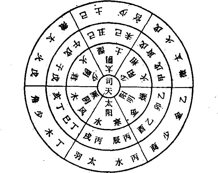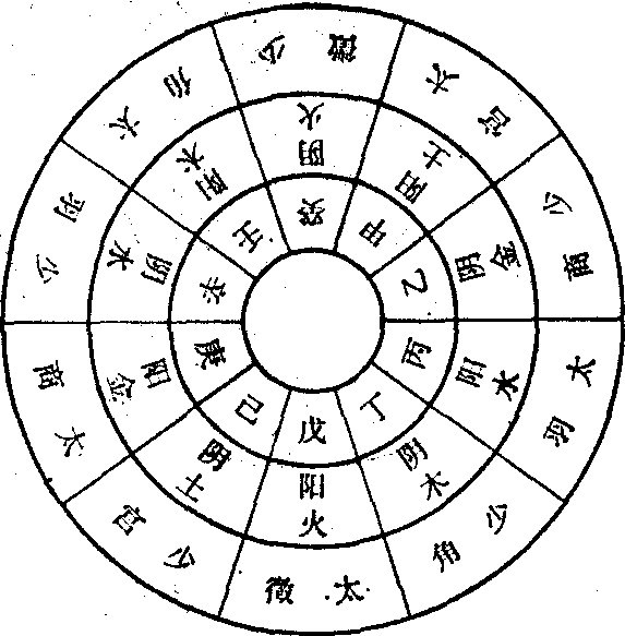五运主运图 从上图看出,要了解主运的具体内容,必须首先弄清以下几个问题。 五音建运 五音,即宫、商、角、徵、羽。宫为土音、商为金音,角为木音、徵为火音,羽为水音。由于五音亦生于五行之气,所以它们亦分别属于五行。角者,触也,由阳气的触动而发生,木亦是由阳春之气发动而生者,所以角为木之音。徵者,止也,阳盛而极,物盛则止,火为盛阳之象,司炎暑之令,所以徵为火之音。宫者,中也,为中和之义,惟土居中央,化生万物,所以宫为土之音。商者,强也,为坚强之义,五行惟金最坚刚,所以商为金之音。羽者,舒也,阴尽阳生,万物将舒,惟水令具有这种生机,冬尽春回,水能生木,所以羽为水之音。将五音与十天干的五运联系起来,称为“十干建运”。宫为土音,建于土运,为十干为甲己;商为金音,建于金运,在十干为乙庚;羽为水音,建于水运,在十干为丙辛; 角为木音,建于木运,在十干为丁壬;徵为火音,建于火运,在十干为戊癸。 太少相生 由于十干有阴阳之别,五音建于五运,亦应有阴阳的区分,据《素问·六元正纪大论》所述,它是以“太”和“少”来分辨五音的阴阳。如: 十干以甲、丙、戊、庚、壬为阳,乙、丁、己、辛、癸为阴,在阳干则属太,在阴干则属少。故甲己土均为宫音,阳土甲为太宫,阴土己为少宫。乙庚金均为商音,阳金庚为太商,阴金乙为少商。而辛水均为羽音,阳水丙为太羽,阴水辛为少羽。丁壬木均为角音,阳木壬为太角,阴木丁为少角。戊癸火均为徵音,阳火戊为太徵,阴火癸为少徵。五运的相生,既为木生火,火生土,土生金,金生水,水生木。五音既建立于五运之中,当然亦必以五运之相生而生。但除此而外,另有一太少互为相生之义存乎其中。所谓太少相生亦即阴阳相生。试以甲己土年为例,甲为阳土,土生金,便是阳土生阴金,于五音便是太宫生少商; 金生水,便是阴金生阳水,也就是少商生太羽;水生木,便是阳水生阴木,也就是太羽生少角;木生火,便是阴木生阳火,也就是少角生太徵;火生土,便是阳火生阴土,也就是太徵生少宫。己为阴土,土生金,便是阴土生阳金,也就是少宫生太商;金生水,便是阳金生阴水,也就是太商生少羽;水生木,便是阴水生阳木,也就是少羽生太角;木生火,便是阳木生阴火,也就是太角生少徵;火生土,便是阴火生阳土,也就是少徵生太宫。如此太少相生,往复无穷,以推衍运气阴阳的种种变化。太为有余,少为不足,不仅纪主运是如此,中运、客运,亦各有太少相生之义。兹图示如下: