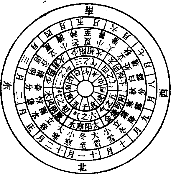 六气正对化图 从上图可以看到: 子与午相对,午为正方,子为对方;丑与未相对,未为正方,丑为对方;寅与申相对,寅为正方,申为对方;卯与酉相对,酉为正方,卯为对方;辰与戌相对,戌为正方,辰为对方; 巳与亥相对,亥为正方,巳为对方。所谓正方,不是取其方位所在的意义,而是具有五行相生的道理。例如: 子与午均为君火,但午之方位在正南,在月建为五月,南方与五月仲夏均属火,所以午为正方;子为十一月月建,居正北方,与正南方的午遥遥相对,故在对方而从化。丑与未均为湿土,未为六月月建,六月为长夏,正当湿土的旺季,所以未为正方;丑为十二月月建,与未遥遥相对,故居于对方而从化。寅与申均为相火,正月建寅,在时令为孟春,正当木气旺时,木能生火,为火之母,所以寅为正方;申为七月月建,七月初秋属燥金,是下半年的第一个月,与上半年的第一个月遥遥相对,故申为对方而从化。酉与卯均为燥金,酉为八月月建,正是西方金气旺盛的季节,所以酉为正方;卯为二月月建,八月仲秋,二月仲春,仲春卯月与仲秋酉月遥遥相对,故卯居于对方而从化。辰与戌均为寒水,九月建戌,为秋金隆盛之时,金能生水,为水之母,所以戌为正方;辰为三月月建,三月为季春,与季秋戌月遥遥相对,故居于对方而从化。亥与巳均为风木,十月建亥,为水令之孟冬月,水能生木,为木之母,所以亥为正方;巳为四月月建,属孟夏月,与孟冬月遥遥相对,故居于对方而从化。通过这样正对化的关系,十二支与六气的归属,便成为: 子午属少阴君火,丑未属太阴湿土,寅申属少阳相火,卯酉属阳明燥金,辰戌属太阳寒水,巳亥属厥阴风木。 主气 亦称地气,即风木、君火、相火、湿土、燥金、寒水六气,分主于春、夏、秋、冬二十四节气,显示着一年季节的显著变化,所以它的次序仍是按着木、火、土、金、水五行相生的顺序而排列的。厥阴风木为初气,主春分前六十日八十七刻半,以风木是东方生气之始,所以为初气。从十二月中的大寒节起算,经过立春、雨水、惊蛰,至二月中的春分前夕。木能生火,则少阴君火为二气,主春分后六十日又八十刻半,从二月中的春分起算,经过清明,谷雨、立夏,至四月中的小满前夕。火要分君火和相火,两火相随,君火在前,相火在后,所以少阳相火势必要紧接着君火而为三气,主夏至前后各三十日又四十三刻有奇,从四月中的小满起算,经过芒种、夏至、小暑,至六月中的大暑前夕,火能生土,则太阴湿土为四气,主秋分前六十日又八十七刻半,从六月中的大暑起算,经过立秋、处暑、白露,至八月中的秋分前夕。土能生金,则阳明燥金为五气,主秋分后六十日又八十七刻半,从八月中的秋分起算,经过寒露、霜降、立冬,至十月中的小雪前夕。金能生水,则太阳寒水为终气,主冬至前后各三十日又四十三刻有奇,从十月中的小雪起算,经过大雪、冬至、小寒,至十二月中的大寒前夕。一年的主气,至此而一周,兹列图说明如下:
