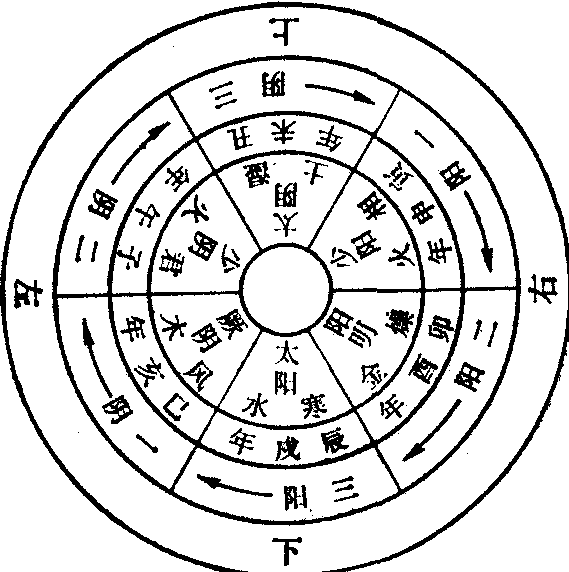 司天在泉左右间气图 六步客气在天的位置,也就是按着这样顺序排列的。古人以为地包于浑天之中,因而假设人居于上列六个小圆图任何一图的圆心,则面对少阳时,阳明在右; 面对阳明时,太阳在右,即所谓“南面而待之”也。“上下有位”,即司天在上,在泉在下,各定其位。上下之位既定,司天既有其左右间气,在泉亦自有其左右间气,这便是“左右有纪”。总之,六气的互为司天,互为在泉,互为间气,是按着十二支的顺序,迭为迁移的,如下图所示: