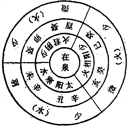 同岁会 凡逢阴年,不及的中运之气,与在泉之气相合,即称同岁会。原本中运与岁支之气相同,才称岁会。但司天在泉之气,仍取决于岁支,今中运与在泉之气合,并不是完全取决于岁支,而是据岁支所主的在泉之气,这便与岁会有似同而实异,所以称同岁会。如: 癸巳、癸亥、癸卯、癸酉年,中运都是少徵癸火,惟巳亥两年的客气,是少阳相火在泉; 卯酉两年的客气,是少阴君火在泉。以火运少徵,分别与在泉的少阳相火和少阴君火之气相合,是为同岁会。又辛丑、辛未年,中运是少羽辛水,丑未为太阳寒水在泉,不及的辛水,与在泉的太阳寒水之气相合,仍属于同岁会。兹列图如下: