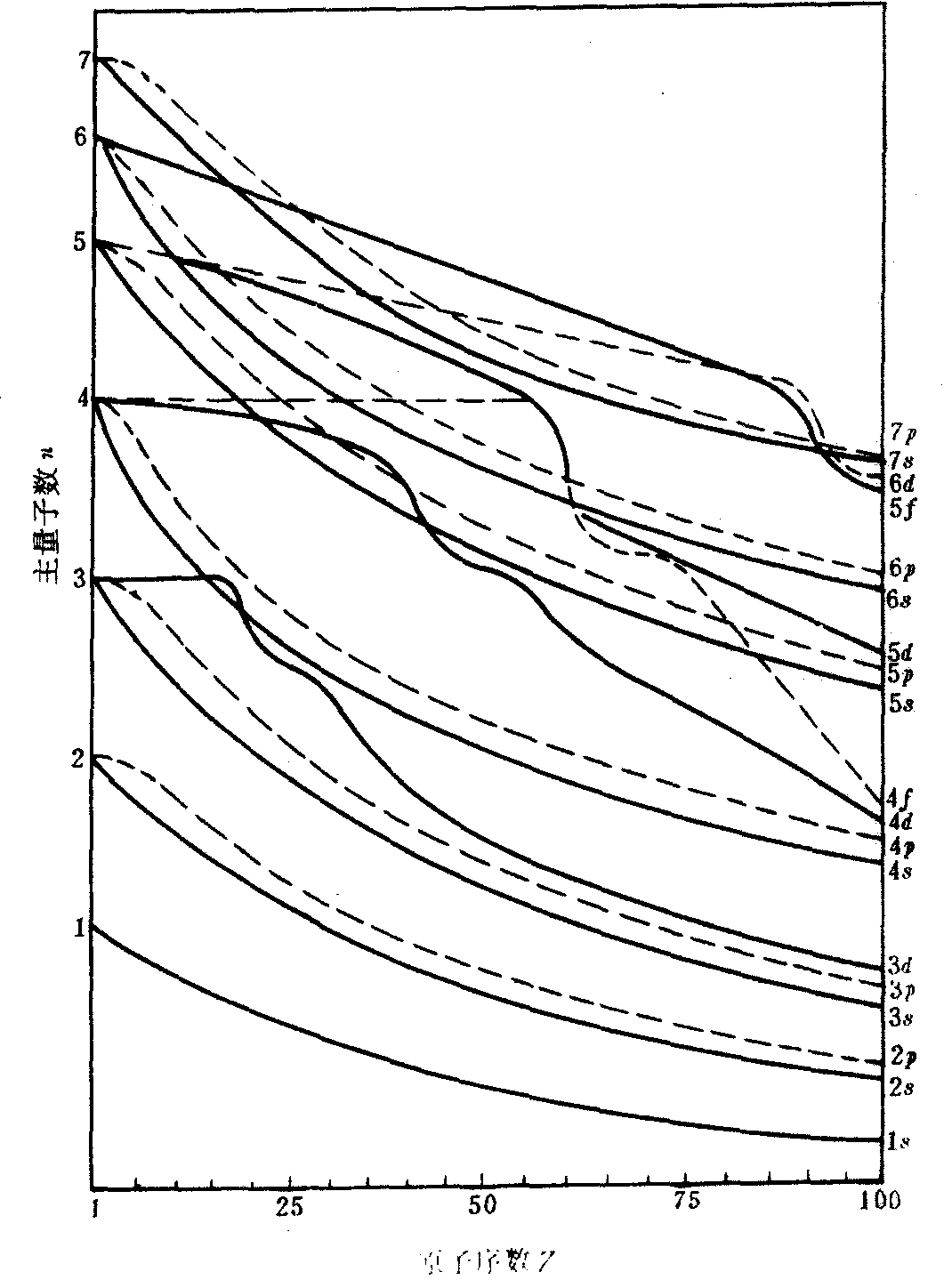般会逐渐下降。而且不同元素原子轨道能量下降的多少各不相同,各轨道能级之间的相对位置也就会随之改变,见图2。例如,当原子序数大于21时,3d能级低于4s能级。一般来说,原子序数Z增加到相当大时,n相同的、充满电子的内层轨道,由于l不同引起的能级分裂则相当小。所以内层轨道的能级,主要由主量子数n来决定。实际鲍林能级图是外层电子能级图。