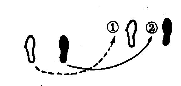 步法术语。指两脚开立时,一脚盖越另一脚向对侧落步,后脚紧接向同侧方向横迈一步的步法。其足跡迹线如图。
