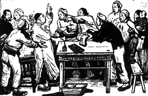 【作品赏析】: 《减租会》是古元的著名作品。 “减租减息”是党在抗日战争期间实行的一项重要政策。此帧作于1943年。木刻生动地刻画了减租会的场面。 这是在地主家里,八仙桌上放著算盘、水烟壶,地上放著一个大斗,四个农民激动地进行著说理斗争:一个手指账本,一个指著地主愤怒地指责,另两个也都据理而争。 那个地主身穿皮袍,留小胡子,正指天起誓,好象在说什么天地良心之类的话。他的狡猾抗拒减租的态度被刻画得入木三分。左角上有两个老年农民,看样子象是中农或富裕中农,他们不那么积极,也没有多大反感。右边那个端著旱烟的老农,好象胆子不大,心里有话但又不大敢讲……整个木刻以阳刻为主,形象富于典型性,有性格,情节生动,引人入胜。 在这样小的篇幅里刻画这么众多的人物,表明画家对生活的熟悉和驾驭雕刀的能力。作为一个历史时代的斗争生活的深刻描绘,《减租会》已经成为史诗性的作品了。。  现代 古元 黑白木刻 纵13.5厘米 横20厘米 |