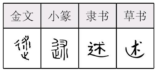 shù形声,从辵,术声,本义为遵循,引申为阐述前人的见解、陈述、记述等。 【辨析】 ❶述/叙/陈/说 这四个字都表示叙述、向人说话义,是同义词,但有微别:“述”指述说出现过的事、说过的话,侧重于遵循陈迹;“叙”指叙说事情的原委,侧重于先后次第;“陈”指陈述事实,侧重于一一罗列;“说”指解说道理或自己的看法、主张,讲述事情的经过,侧重于解释,使人相信。 ❷述/術(术)/遂/隧 见565页“术”。述 篆 隶shù【析形】形声字。古文字形从辵,术声。从辵,表示与行走有关。 【释义】《说文》:“循也。”本义是遵循。引申为记述,叙述,又指阐述前人成说。[述而不作]即阐述前人成说,自己并不创新。“作”与“述”代表了中国传统学术上的两种境界。“作”是创新,《世本》有《作》篇,记述的如“蚩尤作兵”、“仓颉作书”等都是指创造发明。“述”是继承延续,在前人的基础上补充生发。 【shape analysis】It is the pictophonetic character.In ancient character the meaningful part is辵(chuò,walk).The phonetic component is术(shù). 【original meaning】Abiding by something.It is extended to mean describing and narrating. |
