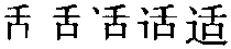 【提示】舌,起笔是撇,不是横,不要写成舌。辶,3画,上面一点; 旧字形4画,上面两点。辶的第二笔,宋体是横折,楷体是横折折撇。 *适kuò9画 辶部 〈书〉 疾速。多用于人名: 南宫~(孔子弟子)。 另见shì(369页)。