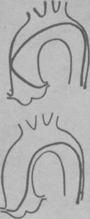 图1乙 Bourassa选择性左、右冠状动脉造影心导管 图示心导管顶端的形态,左为左冠状动脉造影心导管,右为右冠状动脉造影心导管。 (2) 经皮股动脉穿刺法:本法操作比较简便,双侧造影成功率在98%以上,故目前应用较广。所用心导管为顶端具有特殊弯度的Jud-kins或Bourassa心导管(图1)。按股动脉穿刺施行逆行性左心导管检查法穿刺股动脉,将导引钢丝置入股动脉内,拔出穿刺针,并套上短而较硬的聚四氟乙烯扩张导管,沿钢丝送入动脉以扩张动脉穿刺口后,拔出此扩张导管,将左侧冠状动脉造影心导管套在导引钢丝尾端上,沿钢丝一直将此心导管的顶端送到皮肤小切口处,此时钢丝的尾端必需露出心导管尾端之外,在钢丝的导引下,操纵心导管,使其经股动脉的穿刺口进入动脉。其后即在X线透视下将心导管逆血流经髂动脉、降主动脉、主动脉弓而送达升主动脉。拔出导引钢丝,用50ml注射器接上心导管尾端,不断地缓慢注入含肝素的生理盐水,使心导管内腔保持畅通。病人转左前斜位,将心导管慢慢向前推送,按此类心导管顶端的弯度,其顶端将指向左侧抵住升主动脉的左侧壁(即内侧壁)慢慢下降,一般较易于进入左冠状动脉开口,如未能进入可将心导管后撤,重新再推送,在推送过程的同时将心导管略作顺钟向转动,探索冠状动脉口。据作者等对30余例尸检的观察,左侧主动脉窦位于左侧后部,右侧主动脉窦位于前部,冠状动脉开口的水平在离窦底1.5~2cm之间。在X线下左侧冠状动脉口的位置约在第六胸椎下缘,左心缘的肺动脉段和左心室段交界处水平附近,右侧冠状动脉口较左侧者略低,约在右侧大血管阴影和心缘交界以下1cm处。当判断心导管顶端已进入左冠状动脉口而心电图未见异常发现时,可通过心导管快速注入2~3ml造影剂,在X线透视下观察该侧冠状动脉是否显影,如显影说明心导管顶端确在冠状动脉口内。乃将心导管位置固定。选好X线投照角度,准备好急救措施,在心电图连续观察下,用手推注射法向心导管内迅速推注76%泛影葡胺或66%泛影葡胺和10%泛影钠合剂,一次造影用6~8ml,并进行快速连续摄片或电影摄影,一般取右前斜位20~25°,左前斜位60~70°和侧位,必要时加正位投照。左侧冠状动脉造影完毕后,将心导管迅速撤离冠状动脉口,心导管尾端接上注射器继续注入含肝素的生理盐水,待心导管顶端撤到髂动脉附近时,即向心导管腔内送入导引钢丝; 然后将心导管全部抽出,留下钢丝在动脉内,换用右侧冠状动脉造影心导管继续检查。推送右侧冠状动脉造影心导管时,心导管顶端越过主动脉弓后,按Bourassa心导管的弯度,其顶端将指向右侧抵住升主动脉的右侧壁(即外侧壁)缓慢下降,落入右冠状动脉开口;按Judkins心导管的弯度,其顶端达主动脉窦底部之上3~5cm处时,需缓慢将心导管作顺钟向转,并继续推送,使顶端转向右(外)侧,并落入右冠状动脉口。确定心导管顶端已进入右冠状动脉后,按前法进行造影。由于每次造影注入的造影剂的剂量不大,故可多次注射从不同角度进行摄照,以取得最满意的显影(图2)。造影完毕,拔出造影心导管,局部压迫止血。 ![]() 图2 用Judkins导管进行选择性冠状动脉造影,心导管顶端进入左 (上图)、右(下图)冠状动脉口示意 心导管顶端落入冠状动脉口后不宜继续进入太多,以免阻塞该动脉引起心绞痛、心肌梗塞或严重的心律失常。心导管推送过程中可作血管腔内血压测定,但如无必要不必反复测定,以防心导管内血凝阻塞。心导管如屡次推送均未能入冠状动脉口,则宜更换另一种大小规格的心导管。注射造影剂前先给病人含用硝酸甘油片,以改善心脏血供。但在疑有冠状动脉痉挛的病人,造影前不宜用硝酸甘油含片。在造影过程中心电图可有特异性的改变,若两侧冠状动脉供血范围约略相等时,造影剂注入左冠状动脉将有暂短的类似左束支前分支阻滞的改变;造影剂注入右冠状动脉时则有暂短的类似左束支后分支阻滞的改变,一般不到半分钟即可消失。此外,可有窦性心动过缓、窦性暂停、P波减低、房性或室性早搏、短阵室性心动过速、短阵交接处性心律、房室传导阻滞以及Q-T间期延长等,偶有心室颤动或心脏停搏。 术后处理与左心导管检查和选择性左心造影相同。 选择性冠状动脉造影时两侧冠状动脉可以分别显影,观察其分布、病变及其程度、侧支循环和有无畸形等,拍摄条件优良的X线片可以看到0.6mm以下的细小分支,故对冠状动脉疾病的诊断极有参考价值(图3、4)。 一般认为下列情况可考虑进行选择性冠状动脉造影: ❶冠心病病人准备施行手术治疗,术前需要了解冠状动脉病变情况者; ❷准备施行人造瓣膜替换术而需了解冠状动脉情况者; ❸主动脉-冠状动脉旁路手术后仍有症状,需随访移植血管通畅程度者; ❹临床疑有冠状动脉畸形或其他冠状动脉病变者; ❺个别临床怀疑有冠心病,但尚未确诊,确有必要肯定或排除诊断者。近年有用带球囊的导管置入冠状动脉使之扩张以治疗冠状动脉粥样硬化者,称为经皮血管内冠状动脉扩张术。
