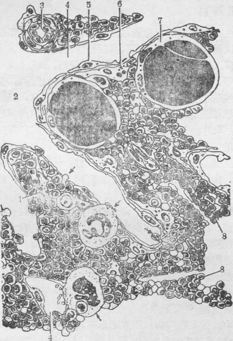红骨髓结构模式图 1.幼红细胞岛 2.中央纵行静脉 3.小动脉 4.血窦 5.内皮 6.周细胞 7.脂肪细胞 8.造血组织箭头示血细胞穿过内皮间隙进入血流 造血微环境不仅包括红骨髓中的网状组织,还包括血窦、毛细血管、微动、静脉以及伴行的神经纤维,它们参与调节微环境中的氧含量、酸碱度、物质代谢、造血因子,并调节血细胞的出入。有实验显示,同系小鼠的骨髓造血干细胞只能在骨髓和脾“落户”发育;同样的骨髓造血干细胞悬液在不同造血器官中生成的各系血细胞的比例不等。在骨髓,粒细胞系生成的比例高;在脾脏,红细胞系的比例高。造血干细胞多位于网状细胞的胞质凹陷内进行增殖和自我更新。新生的造血干细胞一旦离开网状细胞凹陷,就迅速分化,定向发育。在红细胞发生中,造血干细胞先在造血微环境作用下分化成红系祖细胞,再接受红细胞生成素的刺激,进一步增殖分化。若造血微环境有严重缺陷,即使有足够量的造血干细胞,仍会出现造血障碍。造血干细胞的分化是否只由造血微环境决定,尚见解不一。 造血组织中,血细胞的分布颇有规律。巨核细胞常紧靠血窦内皮间隙处,便于释放血小板入血。幼稚红细胞常位于血窦附近,成群地贴附在网状细胞表面,构成幼红细胞岛(见图),随着发育和成熟,逐渐靠近血窦壁。幼稚粒细胞多远离血窦,当发育至晚幼粒细胞具有运动能力时,主动地向血窦移动。 血细胞在造血组织中发育至成熟或接近成熟时穿过窦壁进入血循环。偶见有些血窦腔充满幼稚血细胞,提示可能有少数血细胞是在血窦内发育成熟。近年证实,外周血循环中含有极少量的造血干细胞。一般认为,血细胞是穿过内皮细胞的间隙入血的。造血活跃时,局部堆积大量成熟血细胞,挤压窦壁,使窦壁更薄或不完整,便于血细胞穿过。粒细胞借助变形运动钻过内皮。晚幼红细胞穿过内皮时失去胞核,成为网织红细胞,进入窦腔(见图)。巨核细胞经内皮间隙将血小板排入窦腔。有人观察到,血细胞也可直接穿透内皮细胞的胞质,进入窦腔。 骨髓的血管和神经 骨髓的动、静脉以多种方式和途径进出骨髓,因动物的种属、骨胳的类型及部位而异。例如,长骨有从骨干进入的营养动脉,从骨骺进入的骺动脉和干骺端动脉; 扁骨和不规则骨的红骨髓由营养动脉和骨膜动脉供应。营养动脉从骨滋养孔穿过骨组织进入骨髓后,分成升支和降支沿骨干长轴朝相反方向螺旋状走行,称中央纵行动脉。升、降支在长骨两端与骺动脉的分支吻合。以中央纵行动脉为轴,向骨松质的骨髓腔呈辐射状发出许多小分支,在造血组织附近再分成动脉毛细血管,通连血窦。还有些小动脉先进入骨组织营养骨,可再回到骨髓,通入血窦。血窦彼此通连,多以辐射状向心走行,汇入中央纵行静脉。后者多与同名动脉伴行。根据对兔股骨活体显微解剖观察,红骨髓动脉毛细血管与血窦相连,血循环是封闭的。黄骨髓小动脉的分支成为毛细血管,不形成血窦。骨髓的神经为无髓神经纤维,分布在造血组织和血管壁上。红骨髓有无淋巴管,尚无定论。 红骨髓的功能 主要是造血。成人的红细胞、粒细胞、单核细胞、血小板、B淋巴细胞和NK细胞等均在红骨髓发生。成人骨髓每天(按体重计)产生红细胞约1011/kg,粒细胞约1.6×109/kg,还储备一定数量的造血干细胞和各系造血祖细胞,保持着造血潜能。红骨髓也有防御免疫功能。它含有丰富的单核细胞和巨噬细胞,积极参与吞噬清除病菌、异物及衰老伤亡的血细胞。巨噬细胞能吞噬红细胞碎块,将其消化分解,把从血红蛋白分解出的铁储存,供重新利用。红骨髓是人类B淋巴细胞和NK细胞的发生部位,并向胸腺提供造血祖细胞以发生T淋巴细胞(参见“淋巴细胞发生”条及“胸腺”条)。T、B、NK淋巴细胞分别行使细胞免疫和体液免疫功能,识别和排斥异己大分子抗原。骨髓中有未分化间充质细胞、成纤维细胞以及成骨细胞、破骨细胞等,具有一定的创伤修复及成骨作用。 ☚ 血细胞发生 造血干细胞 ☛ |