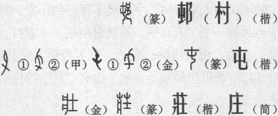 (篆) 汉字是历史车轮的印痕。同样是人居处所的用字,屯是用女性性征的“屮”构成的,代表的是母系聚落的遗存;而莊则是用男性性征的 “士” 组建的,代表的是父系村庄的现在;一个标意为母系聚落的屯居,一个则标意为男权父系的天国,虽差之毫厘,却别之千里。 提起村庄,人们就想起农村。 时下,国人对 “村” 字大概不怀好的印象,特别是在前边再加一个 “农” 字,那就更刺眼了。农村,穷乡僻壤; 农民,粗俗浅陋; 农活,脏累猥琐。究其原因,有对 “村” 的思想局限所影响,也有 “村” 的构形造意所造成。 村,从木从寸,忖省声,为形声兼会意字。“木”在这里是木讷、木偶、木呆和麻木的标意。“寸” 是忖的省形。你想,以木寸之,能对“村”忖出个何等品位?这样说并非出于有意,而是出于字理。 村,一有粗俗意。宋朝戴复古词《望江南》: “贾岛形模元自瘦,杜陵言语不妨村,谁解学西崑?”二有土气意。《西厢记》: “老的小的,村的俏的,没颠没倒,胜似闹元宵。” 三有恶劣意。苏东坡《戏王巩自谓恶客》诗: “连车载酒来,不饮外酒嫌其村。” 四有发怒意。古人将发怒称作 “发起村来。” 五有冒犯冲撞之意。《红楼梦》六十二回: “黛玉自悔失言,原是打趣宝玉的,就忘了村了彩云了。”六当然也有朴实之意。元朝张昱《古邨为曹迪赋》诗:“魏国南来有子孙,至今人物古而村。”《红楼梦》的作者曹雪芹大概对那个 “假语村言” 者印象不佳,故也给他名字中镶嵌了一个 “村” 字。这是近古以来人们对 “村” 字的感受,其中不乏贬斥之意。可是,在远古时代,不管村也好,庄也罢,它们都是人类幼年时期的文明圣殿,量谁也不敢对它品头论足,说半个 “不” 字。