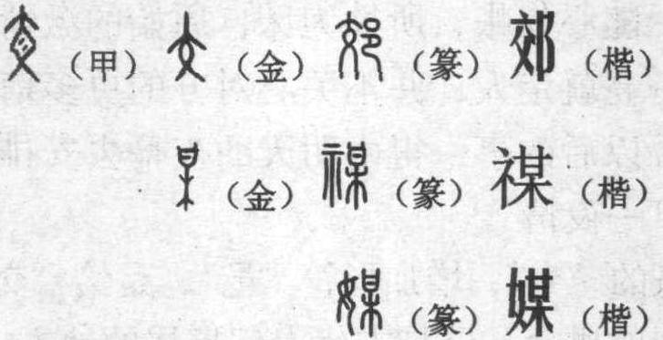甲骨文的 “交”,是“郊”之本字,它的构形有三种说法并行:一是取象说,“交”像“大”(人)交腿状,故曰交叉的 “交”; 二是符号说,“交” 上中下由两个八卦阴符号和两个阳性符号组成并为相交态势,故曰交合的“交”;三是会意说,“交” 甲骨文与“矢”、“寅”为一形,“矢”人们赋予它男性性器的蕴意,故曰“交”是性交的“交”。同时,甲骨文的 “交” 有一形是指事字,即在人的腿弯处点有两点,更容易被人理解为性交的 “交”。 金文的 “交”,按取象说、符号说、会意说,都能说得去,其含义不变。 “交”,殷墟卜辞用作征讨交锋意,“令祟交得”,是卜问征讨是否有所得。在古代 “征战交锋”,对主动方的男性来说,也具有两性交合征战、征服对方的蕴意。 “交”是两性交合的寓意。在母系社会的中后期,族内婚被禁止了,聚落的青年男女求偶得要到聚落以外的地方进行。黄昏以后的郊外,是男女自由恋的天下,他们可以在那里借夜幕的降临自由地选择性对象,除性愉悦以外,相当的目的是为了壮大本族落的人丁,生儿育女。他们这时可以凭着双方释放的信息,有缘分就交合。随心作帐,所欲为床,原始的激情在郊野奔放。天一亮就走人,并不关心对方的更多信息。至于明天黄昏以后的事,得由明天的夜幕去安排。这是古典式的 “一夜情”。 小篆的 “交”,增加形符 “邑”,是给 “交” 增加时间和空间的概念。邑是古代人们聚居的地方,如城邑、落邑、采邑等。商邑,即商朝的都城,在周代大城市称都,小城市曰邑。《周礼·地官·小司徒》: “九夫为井,四井为邑”。《尔雅·释地》: “邑外谓之郊。” 可见,从原始社会的母系时期,到封建社会父系时代的初期,城郊、邑落之外壑野的这片空地,是绝对不会寂寞的。 楷书的 “郊”,是隶变的结果。 郊的本意是表述母系聚落时期和父系家庭的初期那一时期人类婚姻状况的用字,但这种婚姻状况在专偶婚的家庭出现以后就不能像以前那样继续放任。“家” 的出现,是人类社会向前跨越的标志,家庭是封建社会极具活力的细胞。新兴的地主阶级极力维护和巩固家庭的存在,便对现存的婚姻状况作了一次大的手术,对家庭秩序、家庭礼仪也作了前所未有的整肃和做出了严格地规范。 这便引出了下边要说的一个字: 禖。 禖,音梅,金文的 “禖”,实为 “某”(音谋,音梅,酸果名)。某,从“甘”,从“木”,上下结构为会意字。高树(木)以上结满酸甜(甘)的梅子,梅子的佳味极富吸引力,却下不了树枝; 人们想着品尝梅子的滋味,却又伸手不到,于是就构成了“某”(音梅)的意蕴。某是谋的初字,关中土著人至今把心想要干的事而没有明说称作 “某”。 “某” 的原本之意是,双方的有意与心照不宣。这个问题究竟如何解决?造字者想出了一个办法,增加形符 “示”,示者为神,示具有神圣、神奇、神秘、神通的寓意。因为神在古今人的世界里是没有解决不了的问题的。 小篆、楷书的 “禖”,从示从某,某亦声,为形声会意字。“禖” 的字理含意,决定了它是以神灵的身份,充当世间男女婚媾的撮合与祈子求嗣的角色。字书解释“禖”,是媒神和求子之神。邑落之外是婚媾祈子的场所,因古时人们祈子求神,祭祀禖神的祠庙设于郊外,故称“郊禖”。郊禖是祭祀媒神的地方,《诗经·大雅·生民》:“克禋克祀,以弗无子。”是说姜嫄无子的时候去郊外进行了祈子的禋祀以后才生下后稷。《礼记·月令》仲春之月: “以大牢祠于高禖。” 高禖(皋禖)即郊禖,大牢之祭是祭祀的较大规模和较高等级,祠即祠庙。 “禖” 是婚姻秩序的造字。禖的出现,使得对偶婚有了长足的发展,为家庭的诞生铺平了道路。明末清初著名学者顾炎武就有“里人言是古高禖,万世婚姻自此开” 的感慨。 后来,姜嫄成了禖宫的得主。姜嫄禖宫,即姜嫄祠,在今陕西关中西部地处周原的岐山县北七公里凤凰山南麓、《诗经》称作卷阿的周公庙所在地。从古到今姜嫄祠香火旺盛,祈子求嗣者趋之若鹜,特别是每年的农历三月初十是方圆极富盛名的祈子会,会期十天,盛况空前。阳春三月,桃花盛开,春草碧绿,周围百里境内善男信女,踏着春风,云集于斯。他们借朦胧的月色,手挚在姜嫄塑像之前点燃的香头,在山腰的沟壑丛林之间徘徊,这时候的他们,没有羞涩,只有物色,没有胆怯,只有急切。瞅准了目标便交合,与原始社会郊外发生的故事相似。姜嫄遗风,薪火传承。据说周公庙姜嫄祠的祈子会,拯救了许多家庭,它用市场化的运作机制,以媒介与赐送的方式,解决了许多家庭的香火连续,这姜嫄老母真可谓功莫大焉。然而,后来还有一个成全婚姻,缔造家庭的人物,这位功莫大焉的不是别人,它就是“媒”。 如果说“禖” 是姜嫄神灵的化身,那么 “媒” 就是男女双方心灵的使者。“媒” 也即媒妁,“媒” 是斟酌梅子的酸甜与人间的向往这一极佳品味才充当了媒介的角色。媒妁,是专门说合婚姻的人,《诗经·卫风·氓》:“匪我愆期,子无良媒。” 是女方申述她 “不是我一再拖延时间,而是你没有找到好的媒人来说合。”在古代,没有媒妁的婚合是媾合,不仅人所不齿,而且不予认可,《孟子·滕文公》下: “不待父母之命,媒妁之言,钻穴隙相窥,逾墙相从,则父母国人皆贱之。” 周代还设掌管男女媒合的官职,这种官职称媒氏,《周礼·地官·媒氏》: “媒氏掌万民之判,凡男女自成名