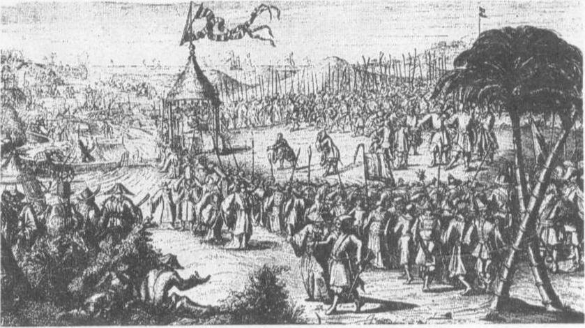 荷兰殖民者向郑成功投降 ☚ 逃人 三藩之乱 ☛ 郑成功收复台湾 郑成功收复台湾Zhengchenggongshoufutaiwan明王朝被农民起义推翻后,朱氏宗室南迁,先后建立起弘光、隆武、绍武、永历、定武等政权。史称南明。郑成功和他的父亲郑芝龙曾在隆武政权下为官。顺治三年(1646)清兵南下,郑芝龙降清,郑成功自称招讨大元帅,以金门、厦门为根据地,率领东南沿海人民进行抗清活动。顺治十六年,郑成功联合浙江张煌言等发动了一次大反攻,从海道溯长江直抵南京。清廷震惊,出兵镇压,郑成功部中计战败,被迫撤退。为了建立根据地,郑成功把目标转向台湾。早在明天启年间,荷兰殖民者就非法侵占我国领土台湾,并一直盘踞在那里,对当地各族人民进行残酷的统治。郑成功利用那里尖锐的民族矛盾,于顺治十八年四月,带领将士25 000人,分乘战舰350多艘,从厦门、金门出发,横渡台湾海峡,在台湾西海岸登陆,“红夷大惊,以为自天而下”(《闽海纪要》卷二)。在台湾人民的支援下,经过与荷兰侵略军的激烈战斗,终于击败了盘距台湾38年之久的荷兰殖民者。次年,荷兰殖民总督揆一被迫投降。台湾重新回到祖国的怀抱。郑成功将台湾作为反清的根据地,在那里设置府县,屯田垦荒,发展生产。对台湾的经济和文化的发展作出贡献。康熙二十二年(1683)清军攻入台湾,置台湾府,隶属福建省。郑成功是清初的民族英雄。