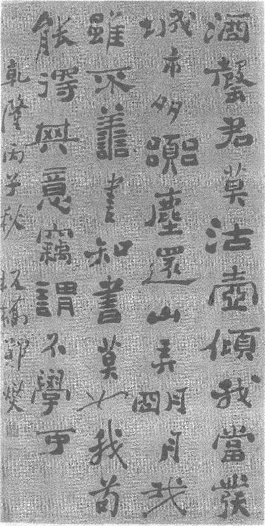| 释义 | 郑燮楷隶书五言诗轴 郑燮楷隶书五言诗轴清。纸本。纵141厘米,横71.7厘米。辽宁省博物馆藏。郑燮(见《郑燮行草书怀素自叙帖轴》书,五言诗云:“酒罄君莫沽,壶倾我当友。城市多嚣尘,还山弄明月。我虽不善书,知书莫如我。苟能得其意,窃谓不学可。”下款署:“乾隆丙子秋,板桥郑燮。”此书楷隶相参,并混有行、草之笔式,细微之处可见山谷之笔意。笔力遒劲古拙,撇笔、捺笔行走挥迤,用笔任情挥洒,笔趣横生。墨色浓郁,字距、行距疏密有致,布局章法舒展爽朗。“乾隆丙子”即公元1756年,是郑氏64岁之作。