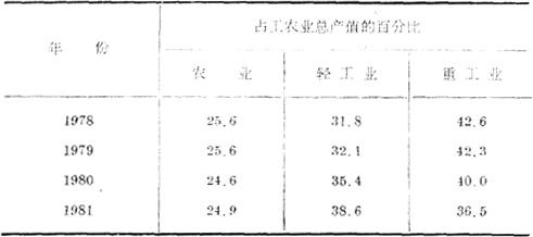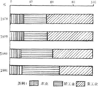 | 释义 | 分段条形图 亦称“结构条形图”。 指用条形全长代表总体的全部,条形内部各分段代表总体的各组成部分,分段的长短表示各组成部分在总体中所占比重的统计图。它主要以各个时期分段条形的比较,来反映总体结构在时间上的变化。 工农业总产值中农业、轻工业、重工业总产值占的比重 (按1970年不变价格计算)