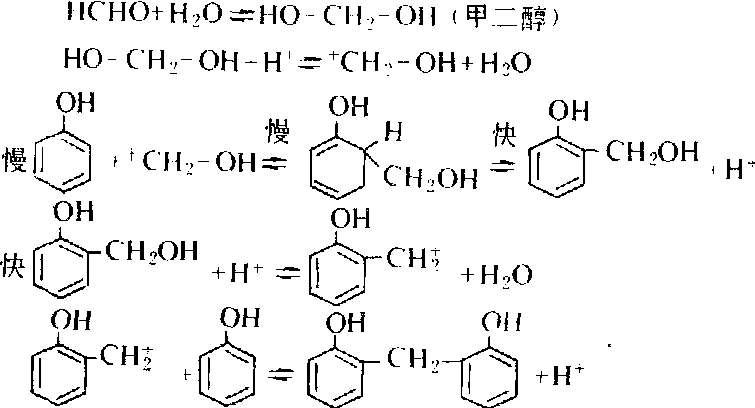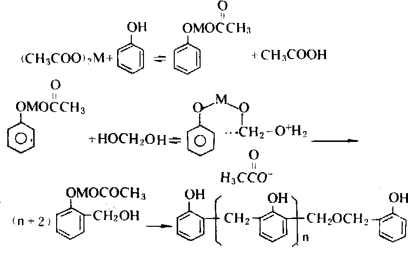 金属离子催化 在一定的酸碱度范围内(pH4~7),以二价金属盐作催化剂,如钙、镁、锌的醋酸盐,同时酚过量。这种树脂的特点是固化速度快,生产过程中的反应热难于控制。方程式如下: