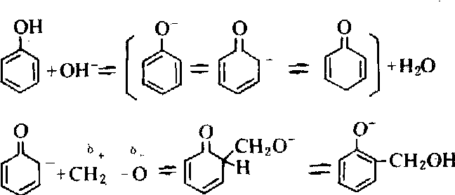 碱催化 甲醛对苯酚的摩尔比为1.5~3.0,多数大于1.5,以氢氧化钠作催化剂,可生成甲阶段酚醛树脂(简称甲阶酚)。一般公认的反应过程是: