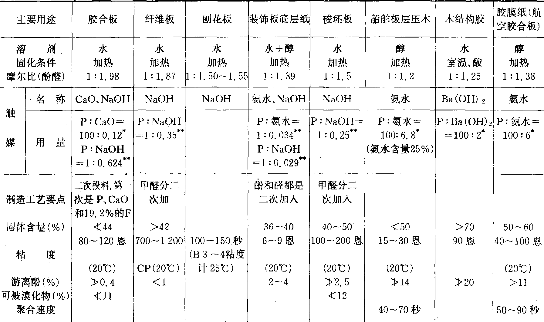 线性酚醛树脂没有足够的羟甲基,是热塑性树脂,加入含亚甲基的成分,如六次甲基四胺才能固化。其机理尚未完全清楚,仅从固化后的树脂呈现黄色,推断含有亚胺基。 固化的酚醛树脂是无定形的,其强度低于理论计算值,显微照片显示有微泡存在。一些研究者认为交联不多,有的推断固化后的酚醛树脂有两相,高分子化合物形成的骨架和充填于骨架中的低分子化合物。 应用 酚醛树脂胶接强度高,有优良的耐水性和耐久性,耐热性也很好,一般作为结构用胶或室外用胶。胶合板常用苛性钠催化的甲阶酚,胶压的板材能耐水、耐候,如滑翔机用航空胶合板即用该胶。纤维板为了增加强度和抗水性,在加防水剂的同时,也加入碱催化的酚醛树脂,利用它在铝盐和酸作用下析出的特点,使其沉积于纤维上。刨花板用于室外或作结构材料者,需用酚醛树脂胶粘剂。由于酚醛树脂固化较慢、对刨花含水率要求严及价格较高等原因,在刨花板的生产中应用较少。旋切单板浸渍酚醛树脂(醇溶性或水溶性)可压制成木材层积塑料,用于制造机械零件、耐磨材料、纺织梭子等。纸质层压板有工业用板和装饰用板两类。工业用层压板是将浸胶纸或浸胶布组坯热压成型,用作电气绝缘材料或耐磨材料。装饰板以牛皮纸浸酚醛树脂的胶膜纸作底层,上盖装饰纸等热压成型。此外,酚醛树脂还可用于涂料、模塑、研磨材料以及制酚醛纤维等方面。 中国木材工业中常用的酚醛树脂见下表。 常用酚醛树脂胶简介