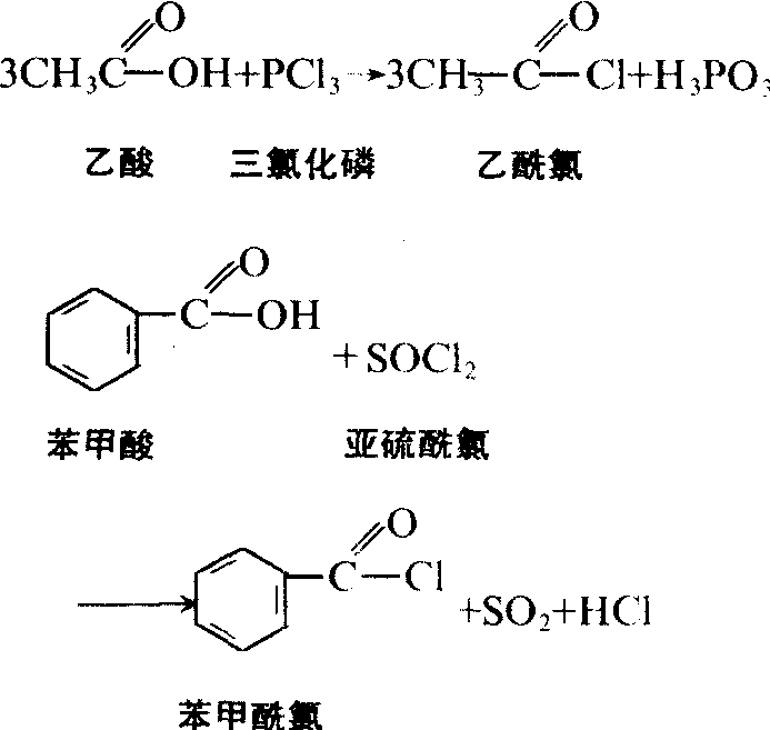 酰氯的化学性质很活泼,容易与水、醇、酚、氨等作用,在这些化合物分子中引入酰基,形成羧酸、酯、酰胺: