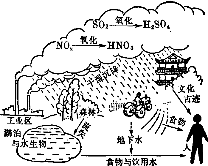 酸雨影响环境和人的某些途径示意图 酸雨的危害是多方面的,作用是缓慢的,但它的影响面很广(见图)。 主要危害有: ❶酸雨出现时,空气中硫酸雾和硫酸盐雾增多,硫酸雾对人的毒性比二氧化硫约高10倍,其微粒可随呼吸而深入肺部组织,引起肺水肿和肺硬化等症。 ❷使水体酸化,鱼卵不能孵化或成长,有毒金属从土壤或底泥中溶出,增加对鱼类的毒性,影响水生动、植物的生长,甚至鱼类绝迹。受酸雨影响而酸化的水体,由于微生物的活动受影响,从而使有机物分解速率缓慢,有机物沉淀增多。目前,有些国家和地区,因为水体酸化,使得一些河流、湖泊“死亡”(即水生动、植物不能生长)。 ❸酸雨破坏土壤和植被。在酸雨影响下,一方面土壤中的钙、镁、钾等养分被淋溶,使土壤日趋贫瘠;另一方面使土壤中微生物群体的生态系统混乱,影响氮的生成,从而影响农作物和其他植物的生长;酸雨污染严重时,可直接使农作物和其他植物枯黄。 ❹腐蚀建筑物和其他设施,使一些历史文化古迹和现代化建筑物的腐蚀速度加快,维修周期缩短,使用寿命降低,造成难以估量的经济损失。 我国酸雨成分中硫酸占总酸量的90%以上,说明我国酸雨主要是大气中二氧化硫造成的。因此,防止酸雨污染的根本措施主要是改变能源结构,减少由于燃煤而带来的二氧化硫对大气的污染。另一方面对煤碳进行洗选加工,回收硫精矿;以及采用排烟脱硫技术,回收二氧化硫,以减少燃煤过程向大气排放二氧化硫。 ☚ 二氧化硫污染 硫化氢污染 ☛ |