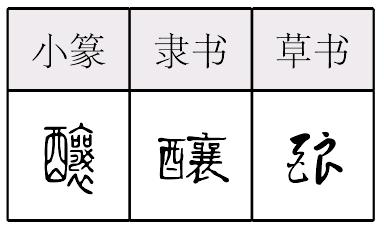 niànɡ釀,形声,从酉,襄声,本义为制酒,引申为酒、逐渐形成等。《简化字表》简作“酿”,音符改为良。 【辨析】 酿/酝 见528页“酝”。酿 釀; 篆 隶niàng【析形】形声字。小篆字形从酉(酒),襄声。今简化字作“酿”,从酉,良声。 【释义】《说文》:“酝也。作酒曰酿。”本义是酿酒。古代的酒一般都是黍、秫煮烂后加上酒母酿成的,成酒的过程很短,而且没有经过蒸馏,其所含酒精量远远低于现在一般的酒。由酿酒可引申泛指利用发酵作用酿造蜜、醋、酱等,如[酿蜜];用作名词也指酿造的酒,如[佳酿];又引申比喻逐渐形成,如[酿成大祸]。[酝酿]造酒材料加工后的发酵过程,比喻事前考虑或切磋协商使条件成熟。 【shape analysis】It is the pictophonetic character.In small seal script the part 酉(yǒu,wine)is as an ideogram and 襄(xiāng)as a phonetic sign. 【original meaning】 Making wine. Chinese ancient wine was made by putting yeast into well—cooked millet and sorghum without distillation. The process finished in short time, so with much less alcohol than wine today. |
