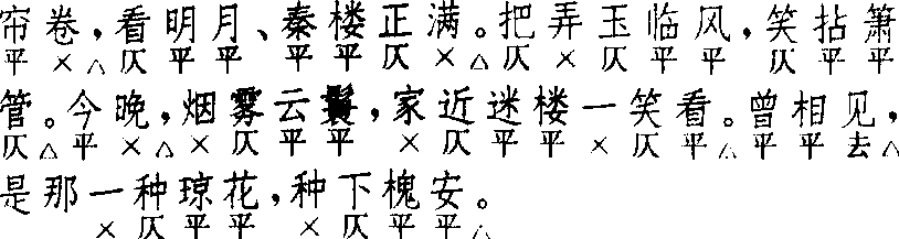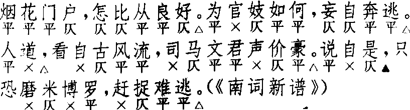 醉翁子 醉翁子无名氏 《锦香囊》  前腔 换头 汤显祖 《南柯记》  正格十句:4,5 △。5,4 △。4,7 △。3 ▲,4,4 △。换头格十句:2 △,7 △。5,4 △。2 △,4,7 △。3 △,4,4 △。第三句按律为上一下四句式,第一字为领句字,宜用去声;按文意则连下句为上三下六句式。换头格首句为二字句,首二句字数同正格,均为九字。第三句以下相同。〔醉翁子〕联入〔锦堂月〕套中,例用换头,无用正格者。末三句与〔锦堂月〕同,故《精忠记·赏春》此曲末三句作“合前”,即指此三句与〔锦堂月〕相同而言也。《六十种曲》排印本《精忠记·赏春》此曲断句多误,以致面目全非。〔醉翁子〕连用二支或一支入套,例用在〔锦堂月〕与〔侥侥令〕之间;偶有缺用〔醉翁子〕者,如《西厢记·堂前巧辩》、《寻亲记 ·遇恩》;叠用二支不入套者,如《怀香记 ·托婢传情》,实不多见。一名〔醉公子〕。与词牌〔醉公子〕令、慢均不同。以〔醉翁子〕为主的集曲有〔醉侥令〕(即〔醉侥侥〕,有二体)、〔醉翁对东风〕(即〔公子醉东风〕),见《南词新谱》、《南词简谱》。 ☚ 锦堂月 侥侥令 ☛ 00007677 |