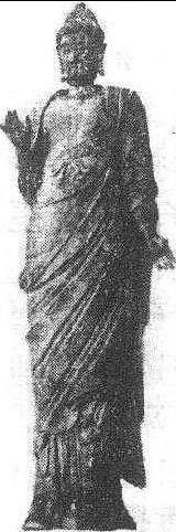 | 释义 | 释迦立像宋代,发现于陕西省西安市。铜铸释迦立像,高2.42米。头部和身体分别铸造,然后组合而成。整体造型比例适当。高螺髻,大耳,身披袈裟,胸部裸露。双手腕佩镯,右手前伸,左手翻垂。下身著折裙,赤足。面目表情庄重有神。服饰上加阴刻花纹图案,胸前饰有两组龙凤图案。现藏于旅顺博物馆。