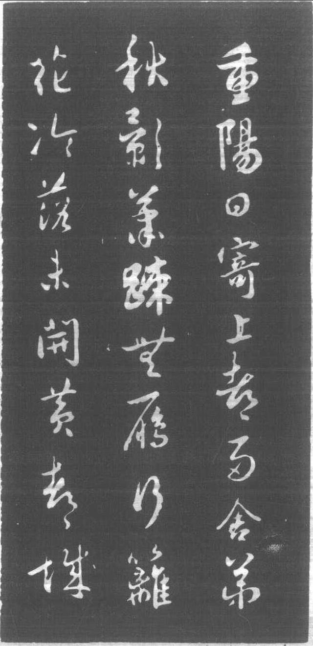 重陽日寄帖 (局部) 北宋薛紹彭書。七絶一首,行書六行,題為“重陽日寄上都兩舍弟”。書法婉潤沈厚,更添優雅之趣,誠為佳品。刻入 《停雲館帖》。吴榮光題跋二行:“道祖 (薛紹彭)詩,乃覃溪老人(翁方綱) 之手模,真迹在歸安姚文僖家。”今不明踪迹。 |