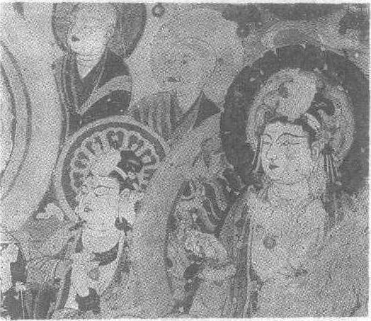 | 释义 | 金刚经变(局部)壁画 金刚经变(局部)壁画中唐(吐蕃时代)。纵36厘米,横40厘米。甘肃省敦煌县莫高窟第112窟南壁西侧壁画。图中绘一年轻弟子,一年长弟子,两身菩萨。年轻弟子宽额丰颊,天真稚气;年老弟子目光犀利,持重世故;菩萨端庄温柔。作者运用纯熟简练的画笔将不同人物的性格特点传神地表现出来,服饰和发髻晕染层次丰富,人物面部的淡彩晕染增添了表现力,是这个时期优秀的人物肖像作品。