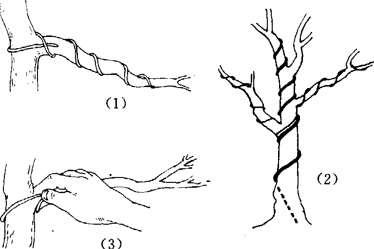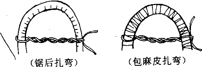 图1 金属丝整形示意 加工步骤可按主干、主枝、侧枝、细枝顺序自下而上、从轴线向外缘逐级进行。左右相邻侧枝均需绕扎时,可用一条金属丝通过中介枝兼顾两端作过桥式绕扎,其绕线走向必须与中介枝已绕的线路并行而不露间隙。枝条需作深弯度时,应让金属丝通过弯部脊背以增强拉力,并以姆指轻压枝脊,以食指和中指从下方顶住。直径近2cm的粗枝作弯前,需以麻皮或布条加以裹缠,并于弯部脊背加衬一条麻筋。单靠金属丝扭扎难于弯曲的粗枝,应在作弯的适当部位纵向切开达木质部3/4的深度。也可对剖开通,再以胶布包扎,并于枝脊加一段较小的金属丝保护,然后扭定加固(图2)。