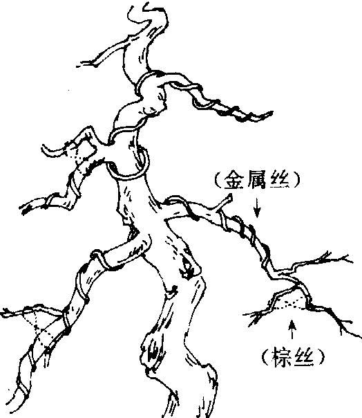 图3 金属丝结合棕丝整形示意 已定型的桩景,数年后部分树枝可能还原返野,应再作整形。 |