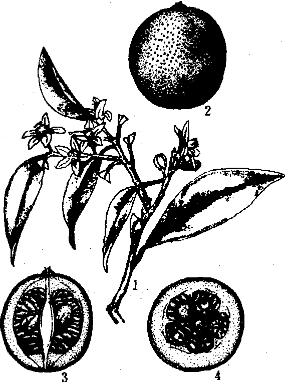 罗 浮 1. 花枝; 2. 果实; 3. 果实纵剖面; 4. 果实横剖面 主要种类 本属有罗浮、圆金柑、长叶金柑、山金柑4个种和金弹、长寿金柑2个杂种。❶罗浮 F.margarita (Lour.) Swingle(见图)。又名金枣、牛奶金柑、长实金柑、枣橘。灌木或小乔木。树冠半圆形。叶厚先端钝,主脉不明显。花较大,花瓣5片,花丝联并,柱头扁圆钝形。果实倒卵圆形, 金黄或橙黄,果肉橙黄色, 汁少味酸, 微有苦味。 ❷圆金柑F. ja-ponica (Thunb.)Swingle。又名罗纹、金橘。树形低矮, 为灌木。枝纤细, 多分枝, 枝上有短刺, 着生于叶腋。花小腋生、花瓣5片, 白色,柱头黄色。果实圆形,果面粗糙,果皮薄, 橙黄色, 果肉淡橙黄。 ❸长叶金柑F. polyandra (Ridl.) Tanaka。灌木。无针刺, 小枝平滑。花常数朵腋生,萼3裂,花瓣5片, 子房椭圆形, 柱头长圆棍棒状。果实圆球形, 橙黄色。 ❹山金柑F. hindsii (Camp.) Swingle。又名山金豆、山金橘、山橘。灌木, 矮小丛生。多短刺, 枝纤细, 幼嫩枝条有棱角。叶短小, 卵圆形,叶脉不明显,有翼叶。花短而宽, 不大开张。果实圆形, 成熟时橙红色,剥皮易, 子房2~4室, 汁胞很小,几乎无果肉。山金柑多野生于山区岩石间, 最抗瘠、抗旱、抗寒。可盆栽观赏。果实可加工成蜜饯或作调料用。 ❺金弹 F.crassifolia Swingle。又名金柑。是圆金柑和罗浮的杂交种。是金柑中栽培最多、果实品质最好、产量较高、果形较大、经济价值较高的一个种。树冠近半圆形。枝较粗长而疏生, 有小短刺。叶厚, 表面色深绿,有光泽,叶稍向内卷折, 有小翼叶。花蕾长圆, 花径粗短,花丝基部联并, 雄蕊12~20, 花柱直立早凋,子房圆形深绿色。果形大, 品质甚佳, 汁少味甘, 适宜鲜食或制蜜饯。不耐瘠, 宜种于肥沃地上。优良品种有宁波金弹、融安金柑、蓝山金柑、遂川金橘、长安金弹等。 ❻长寿金柑(F. obovata Tanaka)。又名月月橘、长寿橘,是金柑与橘杂种, 灌木。枝干无刺, 节间短, 嫩枝呈棱角。叶倒卵形, 稍具翼叶。花萼略带紫色, 花丝联并。果较大, 倒卵形, 囊瓣6~8, 果皮绿黄色, 味甘可食。种子稍多, 多胚性。一般多盆栽观赏。耐寒性弱, 不宜在冬季气温低的地方栽培。 栽培技术要点 金柑多以枳为砧, 进行嫁接繁殖。定植时间最好为春季。株行距2~3米, 每公顷1 350~2 100株。金柑以多主枝自然形整枝。结果母枝有春、夏、秋梢三种。坐果率以春梢最高。培养数量多、质量好的春梢, 是获得丰产的关键。修剪于2月至3月间进行, 疏除与短截相结合, 对长势过旺的长枝及部分春梢宜加短截1/3, 并疏除秋梢, 使树冠形成波浪形, 内部通透。施肥要注意氮、磷、钾配合。秋肥视结果多少而定, 力避秋梢过旺, 以免影响翌年开花结果。 金柑耐寒力尚强, 但在有冻害发生地区, 宜选择避开冻害地段栽植。入冬后要壅土护根、束篷、树盘覆盖地膜及树冠多次喷洒0.5%尿素液,以提高抗冻能力。病虫害有红蜘蛛、卷叶蛾、锈壁虱、金橘芽瘿蚊、树脂病、黄斑病及疮痂病等为害, 应及早防治。 经济价值 金柑为中国的特产果树之一。果小肉厚, 形美色艳, 汁少味甘, 香气浓郁, 除鲜用外, 可加工制罐头及果酱、果酒、蜜饯等。果实还可入药,有助消化, 化痰止咳, 防止感冒之功。树小形美,为庭园绿化等盆栽的良好树种, 长江以南各省均可栽培。 金柑nagami kumquatFortunella margari-ta,别名金枣、金橘、牛奶橘。芸香科金柑属常绿灌木或小乔木。染色体数2n=2x=18。高达4m,树冠半圆形。枝细密,通常无刺,嫩枝有棱角;叶互生,披针形至长圆形,长5~9cm,叶柄有狭翼;花白色,芳香,单生或2~3朵集生于叶腋,花期6~8月;柑果椭圆形或倒卵形,长2.5~3.5cm,金黄色,果皮厚,有香气,果肉多汁而微酸,果熟期11~12月。产中国南部,现各地有盆栽。喜温暖湿润气候,喜阳光充足,较耐阴。对土壤酸碱度适应范围广,最宜pH值为6~6.5而富含有机质的砂质壤土;较耐干旱、瘠薄。金柑全年抽梢三次。多以枸桔作砧木行嫁接繁殖,也可于6~7月间插条繁殖。
