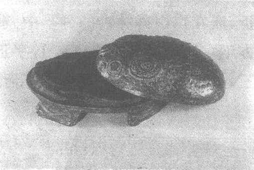 清。长11厘米,宽9.2厘米,高4.5厘米。天津市艺术博物馆藏。澄泥砚用山西绛泥烧制而成,质地精坚,苍紫色。砚盖和器自然相合成一蟾蜍形:首微仰,双目外突,四足伏地作欲跳跃状,其形态逼真、生动;蟾背描金,间有点点红斑痕;砚面浅凹;蟾腹为砚底,上镌楷书印铭:〈陕州工艺局澄泥砚王玉瑞造。〉陕州,今在河南三门峡市、陕县和灵宝一带,此地区制作澄泥砚历史悠久。“工艺局”为清末官办或官督商办的手工业工场;王玉瑞,为制作者的姓名。