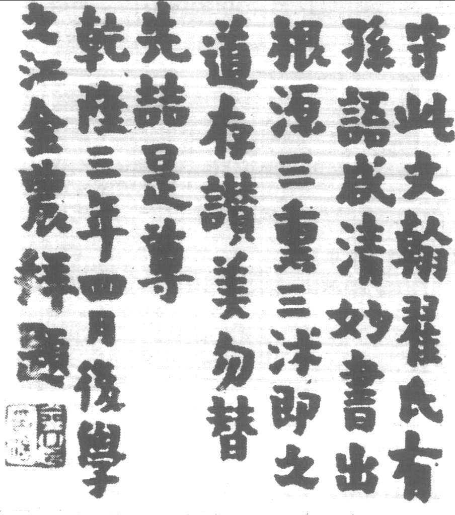 | 释义 | 金農(清·康熙二十六年——乾隆二十八年 1687~1763)錢塘 (今浙江杭州)人。字壽門,號冬心,别號司農,又署心出家盦粥飯僧、仙壇掃花人、古泉、吉金、百二硯田富翁、曲江外史、老丁、竹泉、昔邪居士、金牛湖上詩老、金二十六郎、金吉金、金鐵、耻春翁、壽道士、稽留山民、蓮身居士、龍梭仙客、蘇代羅吉、蘇代羅。乾隆元年 (1736) 薦舉鴻博,不赴,以布衣終。擅詩、書、畫、篆刻,與石貞石、陳竹畦、丁敬等文墨交游。好古嗜奇,屢羈旅吟嘯,足迹半天下。晚年寄寓揚州,鬻書畫自給。詩風高閑有奇氣,畫梅尤工,亦繪佛像。書以分隸卓出,截鐵斬釘,自具特异,獨步一時。猶好金石,喜收藏,金石文字藏儲超千卷。“揚州八怪”、“西泠八家”無金農不成立。《江湜題跋》曰:“先生書淳古方整,從漢分隸得來,溢而為行草。如老樹著花,姿媚横出。”《桐陰論畫》曰:“漢隸蒼古奇逸,魄力沈雄。”向燊謂其 “書法 <天發神讖>,楷、隸古茂淵懿,冠絶一時。”楊守敬云: “板橋 (鄭燮) 行楷,冬心分隸,皆不受前人束縛,自辟蹊徑,然以為後學師範,或墮魔道。”其特异之風不可妄學。嘗書 <齊梁高士傳>。著有 《書竹題記》、《冬心畫記》、《冬心詩集》。
