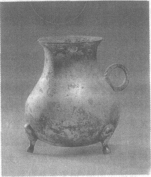 汉。古代炊器。通高11厘米。贵州省赫章县可乐镇出土。贵州省博物馆藏。此鍪腹呈球形,短颈,侈口,马蹄形三短足,颈下一侧铸一环形耳。通体鎏金,光素无纹。