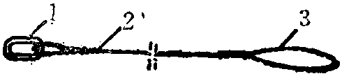 | 释义 | 钢丝绳扣 钢丝绳扣一种装卸长型钢材和原木等货物的索具。在成组装卸和成组运输中普遍使用。主要有钢材和木材钢丝绳扣两种。在港口装卸作业中常用的钢丝绳扣有一头带环,另一头带钩、带环、带琵琶头的三种形式。一头带环,另一头带钩的钢丝绳扣在落关后容易散关,影响成组装卸质量。一头带环,另一头带琵琶头的钢丝绳扣由于琵琶头容易被所装卸钢材轧扁,使挂钩发生困难,故不宜用于钢材装卸。两头带环的钢丝绳扣的两头都便于挂钩,使用方便,磨损不集中于一处,使用寿命较长,但其在落关后抽取很不方便。一般在装卸钢材时大都采用两头带扁圆形钢环的钢丝绳扣;在装卸木材时使用一头带环,另一头带钩或琵琶头的钢丝绳扣。如图示。