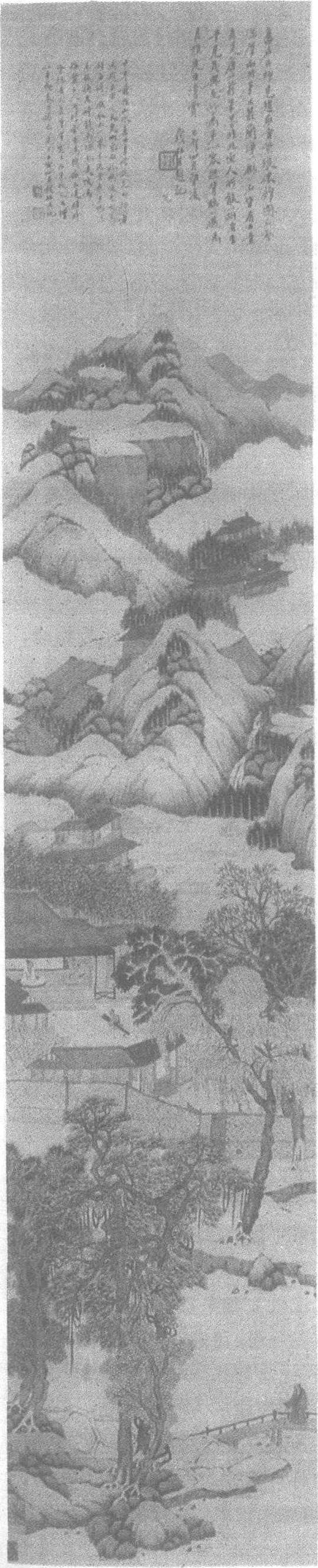 | 释义 | 钱杜紫琅仙馆图轴 钱杜紫琅仙馆图轴清。钱杜绘。纸本设色。纵132.1厘米,横27.2厘米。北京故宫博物院藏。钱杜(公元1764—1844年),初名榆,字叔枚,更名壮,字叔美,号松壶、松壶小隐、壶公等,钱塘(今杭州)人。官至主事。工诗,善画山水,有文徵明风貌。用笔细秀,清新隽永,色调妍雅。亦善画梅,师法赵孟頫,幽冷疏散,与罗聘媲美。著有《松壶画忆》、《画赘》等。此幅是为月樵先生所作。用高远法构图,近景溪水潺湲,小桥横跨,一朱衣老者,持杖而行。河岸古木参天,藤蔓低垂,缠绕其上。中景一座庭院,柴门半开,茅屋数间,中间屋宇内坐二人,一主一客,促膝相谈,浑然忘俗。院中书童抱琴侍立。院后修竹茂密。远景云雾弥漫,峰峦叠嶂,山泉直泻,几处庙宇隐现其间。全幅青绿设色,用笔纤细缜密。山石用牛毛皴,玲珑秀润。树叶双勾,纤巧舒展,设色妍雅,对比柔和,于空灵澹远之中,蕴含着一种幽深清雅之韵味,颇具赵、文山水之神韻。图上方有作者二段题识。第一段款署: “己卯四月望后钱杜并题记。”己卯为嘉庆二十四年(公元1891年),钱杜时年57岁。第二段款署: “道光壬寅四月钱杜又记。”壬寅为道光二十二年(公元1842年),系时隔23年后重题。