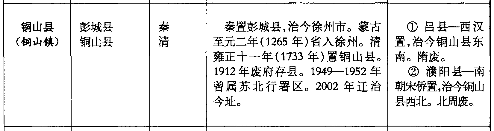 铜山县(铜山镇)彭城县铜山县秦清秦置彭城县,治今徐州市。蒙古至元二年(1265年)省入徐州。清雍正十一年(1733年)置铜山县。1912年废府存县。1949—1952年曾属苏北行署区。2002年迁治今址。❶ 吕县—西汉置,治今铜山县东南。隋废。❷ 濮阳县—南朝宋侨置,治今铜山县西北。北周废。