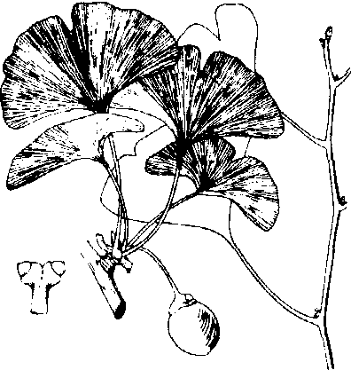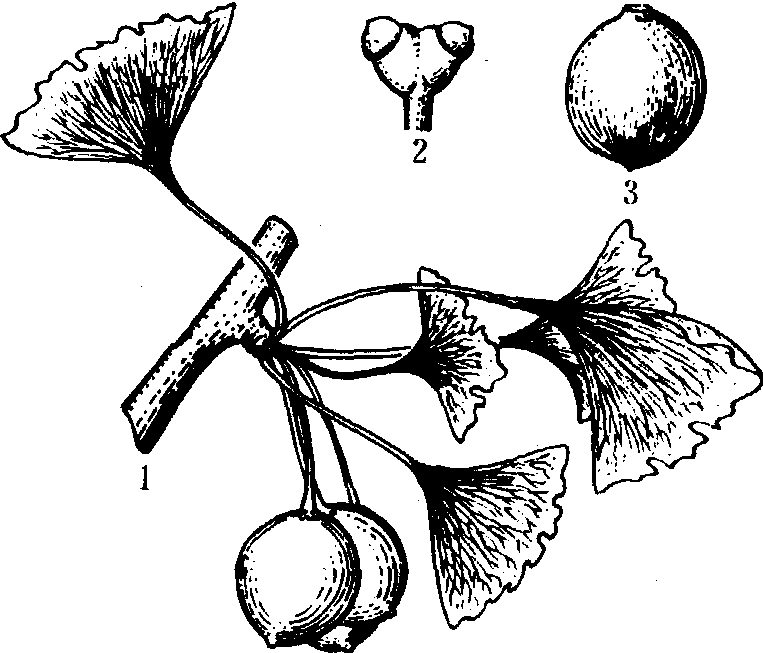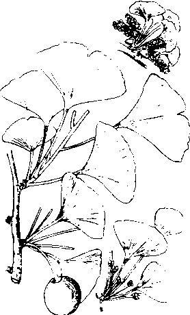 银 杏 1. 果枝; 2. 雌花; 3. 种子 幼树皮淡灰褐色, 浅纵裂; 老树皮灰褐色, 深纵裂。叶扇形, 上缘有浅或深的波状裂刻, 中部裂刻较深; 叶淡绿色, 落叶前变黄色, 具多数平行脉; 有长叶柄; 短枝上叶簇生, 长枝上叶螺旋形排列。雄花为葇荑花序, 4~6个生于短枝上。顶端数芽抽生长枝,其下每节都可能抽生短枝,枝条基部抽生的短枝很短,仅生数片小叶, 结果少, 如无光照条件和营养条件, 不久即枯死。在老树的骨干枝基部或短枝上, 常抽生旺盛枝条, 是一种老树更新现象, 可以培养利用。银杏为裸子植物雌花有两胚珠着生在长柄上, 一般只结一果; 一个短枝可抽生几个雌花, 结3~6果。种子为核果状(非真正果实); 外种皮肉质、黄色;内种皮骨质、白色,长约2.5厘米; 种仁淡绿色, 是供食用部分。银杏属阳性树种,适于背风向阳和光照充足地方栽植。根深, 耐旱, 对大气污染有一定抗性。对土壤条件要求不严, 最好是排水良好、土层深厚、疏松肥沃的沙质壤土,酸性土pH值为4.5或石灰性土壤pH值为8时都能适应。在气候温和、年平均10~18℃、最低温-20℃以上、年降水量600~1 500毫米地区生长良好。低洼水涝、盐碱度高的地方和干燥瘠薄的砾石山地, 生长不良。 品种类型 银杏只有一种,其变种有以下几个:垂枝银杏(G. biloba var. pendula Carr.), 小枝下垂;裂叶银杏(G. biloba var. lacinia Carr.)又称大叶银杏, 叶大裂刻深; 黄叶银杏 (G. biloba var. aureaBeiss.), 叶鲜黄色; 斑叶(花叶)银杏(G. biloba var.uarie carr.),叶有黄斑;近来山东沂源县大贤山织女洞庙发现一株叶籽银杏 (G. biloba var. epiphyllaMak.), 可结圆形、长椭圆形和带叶球果。 银杏栽培品种主要可归为3个类型: ❶梅核银杏类。果圆形或心形,顶部微凹陷; 核卵形或广椭圆形,略扁, 两面显著不同, 两侧棱线呈翼状。如浙江诸暨的大梅核; 广西兴安的桐子果、棉花果、算盘果等。种仁有苦味, 抗旱耐涝。 ❷佛手银杏类。果椭圆形或倒卵形,顶点平或凹陷; 核狭长而尖, 具棱线而翼不显,核饱满,味甘美, 商品价值高。如江苏泰兴的家佛手,吴县的洞庭王; 广西兴安的橄榄佛手、枣子佛手; 浙江诸暨的卵果佛手、长柄佛手、全果佛手、圆底佛手。 ❸马铃银杏。近于上述两个类型的中间类型。果中大,果顶突起明显, 有尖; 核两侧有棱, 翼不明显。果似梅核类, 核似佛手类, 核长大于宽。如浙江诸暨的中马铃、大马铃; 广西兴安的青皮果、黄皮果等。 栽培技术要点 只有中国把银杏作为果树栽培,其他国家主要作为行道树或观赏树。繁殖可用实生、分株、嫁接等方法。实生于当年秋季播种, 如用春播需要层积, 新鲜种子发芽率高, 出苗后当年秋季即可移栽。银杏根部发生萌蘖很多, 可以分株繁殖, 从幼树中挖取雌株根蘖栽植, 成活可靠, 约10年左右开始结果。嫁接用实生苗或分株苗为砧木, 选生长势强、丰产、果大的盛果期雌株,以3年生枝条(具3~4个以上的短枝),在春季用皮下接、劈接和舌接方法均可, 成活率高, 接后3~4年结果。栽植时, 要配置少量雄株为授粉树, 经人工采集花粉, 对水500倍, 加0.1%硼酸, 1%的蔗糖, 喷花, 可增产20~50%。幼树行间,可间作豆类、薯类、花生等作物。施肥都于春秋两季,以秋季施肥为普遍。银杏很少修剪, 只在接后4~5年内分枝过多时疏除部分枝条; 在结果多年, 渐趋衰老时, 进行更新修剪; 老树枯梢现象严重时, 于各主枝基部或主干上一次锯平,形成新的树冠,继续结果。秋季果实变为橙黄色时, 即可采收。最好等待其充分成熟, 自然脱落后, 集中收获。于芦席上堆晒, 使种皮腐烂, 种子与种皮脱离,用水淘净,堆晒2~3小时, 直到种壳发亮时为止。充分成熟的果实, 在低温条件下可较长期的贮藏。 银杏病虫很少, 常见的有: ❶茎腐病。一年生苗受害最重, 使皮层与木质部脱离, 叶片下垂枯死。主要是因夏季炎热, 根颈灼伤, 病菌入侵。夏季行间覆草降低地面温度, 可减少发病。 ❷大蓑蛾。为害叶片,卷成很大的袋囊。用人工摘除越冬虫囊, 喷布杀虫药剂。 ❸天牛类。为害枝干、人工捕捉成虫或药液注入虫孔。 ❹金龟子与木蠹蛾类。用黑光灯诱杀或用1605及锌硫磷等进行防治。 ❺白蚁类。白蚁剥食树木根颈和干部皮层, 蛀食木质部。挖除蚁巢, 用喷粉枪喷蚁穴或用烟剂灭蚁。 经济价值 银杏营养丰富,既是高级的滋补品,又是珍贵的药材。可供炒食或煮成甜食。每100克干果含水分9.1克, 蛋白质13.1克, 碳水化合物71.2克, 钙19.6毫克, 磷427毫克, 铁2.9毫克,此外尚有核黄素、尼克酸、硫胺素等。种仁有补肺、止咳、利尿、清热、平喘、活血等功效; 捣烂外敷, 可治皮肤开裂。种仁含氰氢酸, 不宜多食。叶可提制冠心酮, 可治心血管疾病。花是良好蜜源。木材坚实细致, 可供工艺及雕刻之用。外种皮有银杏酸、银杏醇和银杏二酚,有毒,可以杀虫。银杏大树风姿挺拔, 高耸入云, 植于名胜古迹和古老寺庙, 显得庄重肃穆。幼树笔直刚健, 叶形奇特, 稀疏匀称, 配置于长街两侧, 井然有序; 用于制作树桩盆景, 也格外幽雅, 是良好的绿化、美化的树种。 银杏maiden hair tree;ginkgoGinkgo bilo-ba,别名白果树、公孙树、鸭掌树。银杏科银杏属落叶大乔木。本属仅银杏1种,系中国原产的著名孑遗树种之一。染色体数2n=2x=24(雄株为22A+2Z,雌株为22A+2W)。起源古老,系中国特产的第四纪孑遗树种。银杏科植物发生于古生代石炭纪末期。中生代早期的银杏,为现代种的