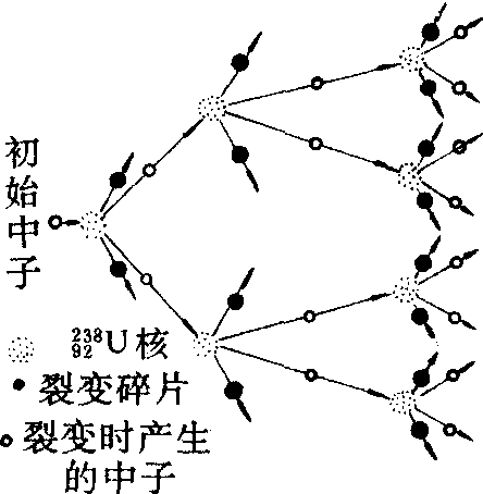 图2 能够使链式反应缓慢地按受控方式进行的装置叫核反应堆。链式反应也可以很快地、不加控制地进行,原子弹就是利用这种链式反应制成的杀伤力很大的核武器。 ☚ 原子核的裂变 临界体积 ☛ 链式反应能自己持续进行的原子核反应。例如铀235的核吸收一个热中子发生裂变,同时放出2—3个中子;这些中子除去损耗后,如能至少剩下 一个以引起另一个铀235核裂变,就可使反应持续不断。 链式反应亦称“连锁反应”。重核受到中子等粒子轰击,在裂变的同时释放出数量增多的第二代中子,这第二代中子又引起重核新的裂变,使产生的中子不断倍增从而使重核裂变持续进行下去的过程。产生自持链式反应的条件有二:(1)参予重核裂变反应的最少裂交物质的数量不小于临界质量(体积); (2)每次分裂产生中子的再生率大于1。原子弹和核反应堆都是根据自持链式反应的原理设计的。 链式反应chain reaction 链式反应chain reaction |