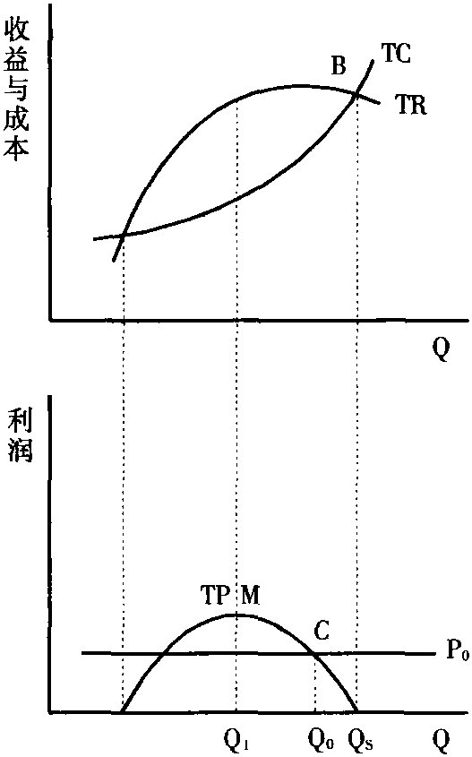 上幅中在B点TR=TC,下幅中TP为零。它和生产与销售Qs单位相应,大于Qs的销售量将带来较高的成本与较低的收益,造成损失,故Qs可视为最大可能销售额,这是纯粹销售量最大化政策,但它从未实行过。销售额最大化论者认识到某个最低利润水平为企业所必须,如图画出为P0,它与TP曲线交于C点,这同约束最大化销售量Q0相应,它是销售量最大化企业的目标。上述鲍莫尔的销售量最大化模式是最为人所知的利润最大化模式的代替物,其直观性强,易为人理解,虽然尚缺少严密的经验证明。