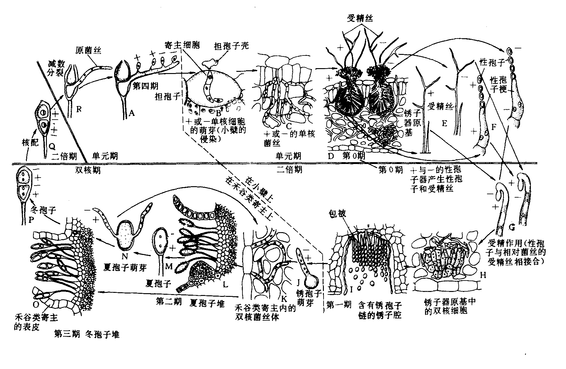 冬孢子和冬孢子堆 是锈菌的有性孢子,从锈孢子、夏孢子或担孢子萌发形成的双核菌丝体上产生。在寄主表皮层或角质层下形成,后外露呈粉状、胶质状或柱状的冬孢子堆,有些种冬孢子堆始终不外露。冬孢子生于冬孢子堆上,单胞、双胞或多细胞,厚壁,有柄或无柄,无色、淡色或深色,表面有刺或瘤,初为双核,经过核配形成单核双倍体细胞。冬孢子形态特征及排列方式,是重要的分类依据。这一阶段的代号为“Ⅲ”。 担孢子和担子 冬孢子萌发产生具有3个隔膜、4个具单个单倍体核的细胞的先菌丝,又称担子。担子的每一细胞生出一个小梗,梗端着生一个担孢子,单细胞,无色或淡黄色。这一阶段的代号为“Ⅳ”。 生物学特性 锈菌均为专性寄生菌,有的种类有转主寄生现象。 寄生性 在自然条件下锈菌是专性寄生的,只能寄生活的植物上,不能营腐生生活。1951年霍特森(Hugh Howison Hotson)和卡特(Victor MacombesCutter)首次报道桧柏锈菌经人工培养成功。1966年威拉姆斯(P.G.Willams)等在澳大利亚报道禾柄锈菌小麦专化型的夏孢子可以在培养基上进行营养生长,1967年他们成功的在人工培养基上进一步获得冬孢子。之后,陆续报道亚麻栅锈菌及石竹单胞锈菌在人工培养基上可以生长; 尽管有上述例子,但只限于极少数锈菌可以人工培养,因此,仍认为锈菌是专性寄生的。 锈菌对寄主植物具高度的寄生专化性。以禾柄锈菌为例,为害小麦的禾柄锈菌不能侵染燕麦,为害黑麦的禾柄锈菌不能侵染燕麦等寄主,因此将禾柄锈菌按其为害的寄主植物划分为7个专化型。同一专化型的禾柄锈菌对同一种植物不同品种间又具高度的专化性,禾柄锈菌小麦专化型,对不同品种的小麦有不同的反应,将其划分为300多个生理小种。如此繁杂的寄生专化型,使植物的抗病育种增加了艰巨性。 转主寄生和单主寄生 是锈菌特有的性状。许多锈菌需要在彼此没有亲缘关系的两种寄主植物上寄生才能完成生活史称为转主寄生; 只需同一寄主植物即可完成生活史的称单主寄生。转主寄生的锈菌,以冬孢子阶段的寄主作为主要寄主,另一个寄主为转主寄主。例如禾柄锈菌,禾谷类作物是它的主要寄主,小檗是它的转主寄主。有些转主寄生的锈菌以经济上重要的寄主为主要寄主,如梨胶锈菌,以锈孢子及性孢子阶段寄生的梨树为主要寄主,冬孢子阶段寄生的桧柏为转主寄主。许多单胞锈菌都是单主寄生的。 生活史 不同的锈菌完成生活史经历的孢子阶段不同,最简单的锈菌生活史只有冬孢子阶段,最复杂的锈菌生活史产生五种类型的孢子,划分成不同的生活史类型。 长(循环型)生活史型(macrocyclic) 产生五种孢子阶段(O,Ⅰ,Ⅱ,Ⅲ,Ⅳ,)的类型的称长生活史型或长循环型(macrocyclic),其中属转主寄生的称转主寄生长生活史型(heteromacrocyclic)(图1),单主寄生的称单主寄生长生活史型(automacrocyclic)。 缺夏孢型(demicyclic)生活史 生活史缺少夏孢子阶段(Ⅱ)类型,其中属转主寄生的称转主寄生缺夏孢型生活史(heterodemicyclic),属单主寄生的称单主寄生缺夏孢型生活史(autodemicyclic)。 短(循环型)生活史型(microcyclic) 缺少锈孢子(Ⅰ)和夏孢子(Ⅱ)阶段,只有性孢子(O)、冬孢子(Ⅱ)和担孢子(Ⅳ)阶段,这类锈菌全部为单主寄生菌。 上述各生活史类型均可以缺性孢子阶段,但担孢子阶段在各类型生活史中均不可缺。 分类 根据冬孢子形态特征进行分类。例如冬孢子是否有柄、冬孢子萌发方式、排列方式是离生或集生(侧面联合)、埋生或外露等,不同学者将锈菌目分为不同的科,近年来有主张直接将锈菌目划分为126个属。其中重要属如图2所示。
