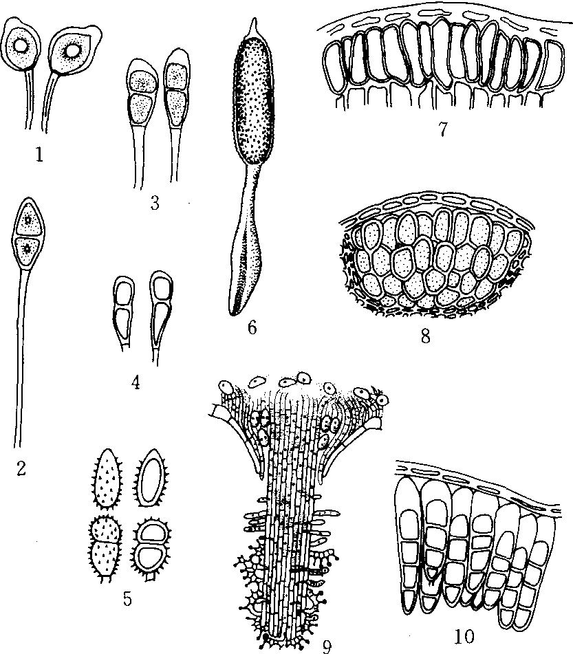 图2 锈菌目常见属冬孢子形态 1.单胞锈菌属(Uromyces); 2.胶锈菌属(Gymnosporangium); 3.柄锈菌属(Puccinia); 4.不休白双胞锈菌属(Leucotelium); 5. 疣双胞锈菌属(Tranzsche-lia); 6.多胞锈菌属(Phragmidium); 7. 栅锈菌属(Melampsora); 8.层锈菌属(Phakopsora); 9.柱锈菌属(Cronartium); 10.鞘锈菌属(Coleosporium) 单胞锈菌属(Uromyces Link) 单主寄生或转主寄生菌。性孢子器球形,有长颈,埋于寄主体内,孔口突出寄主体外; 锈子器杯形,顶部裂开,有包被,锈孢子球形至椭圆形,淡色或褐色,串生或单生柄上; 夏孢子堆初生表皮下,后外露,褐色,夏孢子单细胞,球形至椭圆形或其它形状,表面有刺或瘤状突起,黄色至黄褐色,芽孔明显; 冬孢子堆初生表皮下,后外露,深褐色至黑色,冬孢子有柄,单细胞,顶壁较厚,表面光滑或有瘤状突起,深褐色。是锈菌中较大的类群,寄主分布广,有单子叶和双子叶植物,以豆科、禾本科、百合科及菊科植物为主,如蚕豆单胞锈菌[U.fabae (Pers.) deBary]、豌豆单胞锈菌[U.pisi(Pers.) Schrot.]和疣顶单胞锈菌[U.appediculatus (Pers.) Ung.]。 胶锈菌属(Gymnosporangium Hedw.) 转主寄生菌。性孢子器深埋寄主组织中,成熟时突出寄主组织,初为黄色、后为黑色小点; 锈子器毛状,有包被,初埋生,后外露,锈孢子球形或近球形,表面有瘤,黄褐色,串生; 大多数种缺少夏孢子阶段,夏孢子堆初埋生后外露,夏孢子单生柄上; 冬孢子堆垫状或喇叭状及其它形状,遇水胶化,冬孢子双细胞或多细胞有长柄,柄吸水后膨胀,形成胶质块。在寄主上多年生,引起寄主组织膨胀或畸形。常见的有梨胶锈菌(G.haraeanum Syd.)、山 田 胶 锈 菌 (G. yamadaiMiyabe),锈孢子阶段在梨、苹果上,冬孢子在桧柏上。 柄锈菌属(Puccinia Pers.) 单主寄生或转主寄生菌。性孢子器球形,埋生; 锈子器生表皮下,后外露,杯形或筒形,有包被,锈孢子串生,近球形或多角形,淡黄褐色.表面光滑或有瘤; 夏孢子单胞,球形或椭圆形,黄褐色,表面有突起,单生柄上; 冬孢子堆大多外露或在寄主表皮下,冬孢子双细胞有柄,单生,深褐色; 本属是锈菌中最大的属,有2000多种,中国已报道400余种,主要寄生禾本科植物,此外莎草科、菊科、豆科等植物亦常见,禾柄锈菌(P.graminis Pers.)是重要的植物病原菌。 不休白双胞锈菌属(Leucotelium Tranz.) 转主寄生菌,锈孢子阶段在毛茛科植物上,冬孢子阶段在蔷薇科植物上。基本形态与柄锈菌属相似,只是冬孢子无色,与柄锈菌属不同。亦有人(Thirumalachar和G.B.Cummins 1948)提出本属应作为柄柱锈菌属的同物异名,但未被广大真菌学者接受。常见种有桃不休白双胞锈菌[L.pruni-persicae (Hori) Tranz.],寄生桃、梅引起白锈病。 疣双胞锈菌属(Tranzschelia Arth.) 转主寄生菌,锈孢子阶段寄生毛茛科植物,冬孢子阶段寄生蔷薇科植物,亦有单主寄生的。性孢子器生寄主角质层下,其它各孢子阶段生于寄主表皮下。性孢子器半球形至扁圆锥形; 锈子器杯状,锈孢子串生,球形,黄褐色,表面有瘤; 夏孢子堆垫状,夏孢子单细胞,椭圆形或倒卵形,淡褐色,表面有刺; 冬孢子堆垫状,冬孢子由两个圆形而易分离的细胞构成,有色,表面有瘤。常见种有刺李疣双胞锈菌[T.pruni、spinosae (Pers.) Deit.],引起桃、梅、李等的褐锈病。 多胞锈菌属(Phragmidium Link) 单主寄生菌。性孢子器生寄主角质层下或表皮中,其它孢子阶段生寄主表皮下; 性孢子器近球形或圆锥形; 锈子器裸生,锈孢子球形或椭圆形,串生,表面有小刺; 夏孢子堆粉状,周围有侧丝,夏孢子球形、椭圆形或倒卵形,表面有突起,单生柄上; 冬孢子堆无侧丝,冬孢子单生,3至多细胞,具长柄,柄的下部膨大,具吸湿性,寄生蔷薇科植物,常见的种是蔷薇多胞锈菌(P.rosae-multi-florae Diet.),寄生玫瑰类植物。 栅锈菌属(Melampsora Cast.) 单主寄生或转主寄生菌。性孢子器不显著,圆锥形或半球形,生寄主角质层或表皮下; 锈子器生于叶片上,无包被,锈孢子球形或多角形,表面有突起,无色,串生; 夏孢子堆黄粉状,夏孢子单生,球形或长椭圆形,表面有瘤或刺,无色; 冬孢子堆生角质层或表皮下,扁平,冬孢子单细胞排列成一层,侧面相互结合成壳状的冬孢子堆,深色。锈孢子阶段大多寄生针叶树的针叶上,冬孢子阶段常寄生杨属(Populus)和柳属(Salix)植物,此外,亚麻栅锈菌[M.lini (Pers.) Leᐟv.]引起亚麻锈病,亦常见。 层锈菌属(Phakopsora Diet.) 锈孢子阶段尚未发现,只发现夏孢子和冬孢子阶段。夏孢子堆极小,生寄主叶片表皮下,顶端开口,周围有侧丝,夏孢子单生,球形或椭圆形,表面有刺,无色,黄色或褐色。冬孢子堆生表皮下,扁平或半球形,冬孢子椭圆形或长椭圆形,排成纵列,无色,表面平滑。常见种有枣层锈菌(P.zizyphi-vulgaris Deit.)引起枣树锈病。 柱锈菌属(Cronartium Fr.) 转主寄生菌,性孢子、锈孢子阶段在松属植物上,夏孢子及冬孢子阶段寄生草本植物或落叶树上。性孢子器寄生树杆皮层下呈疱状,常纵裂开孔,无侧丝; 锈子器寄生树杆深处,成熟后破表皮露出,锈孢子椭圆形,串生,表面有突起;夏孢子堆生于叶背面或茎上,有包被,夏孢子单细胞,有柄,球形或椭圆形,表面有刺; 冬孢子堆自夏孢子堆中生出,成熟后破表皮外露,冬孢子椭圆形或梭形,单胞,薄壁,表面光滑,淡色,串生,集结形成圆柱状。常见种有栎柱锈菌[C.quercum (Berk.) Miyabe],锈孢子寄生松树茎干,夏孢子、冬孢子寄生麻栎属(Quercus)植物。 鞘锈菌属(Coleosporium Pat.) 转主寄生菌。性孢子器扁平、圆锥形,寄生叶片表皮下,孔口处无侧丝; 锈子器有舌状包被,锈孢