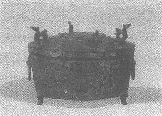 | 释义 | 错金银铜奁尊 错金银铜奁尊战国。通高17厘米,口径24.5厘米,腹深9.5厘米。1965年湖北省江陵望山出土。湖北省博物馆藏。此尊有盖,盖顶凸起成一圆饼形,周围有四个龙形环钮。器壁垂直,下微收。腹外壁有一对兽面形铺首衔环,平底下作兽面矮蹄形足。腹周及盖面皆有错金银丝的卷曲形花纹,纹理纤细匀称。尊是盛酒器。奁是盛梳妆用品的器具,盛行于战国至唐、宋间。所谓奁尊,是指似奁而实为尊的盛酒器。
