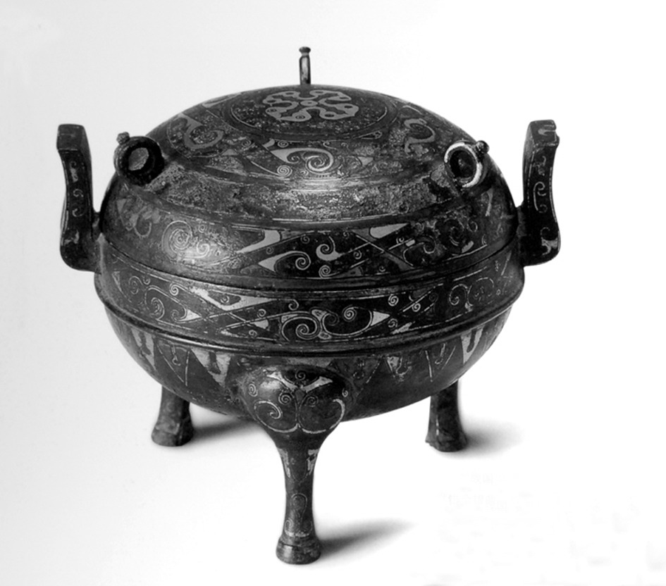 西汉。炊器,礼器。通高16.5厘米,宽16.5厘米,最大腹径13.2厘米,流长3.8厘米。1979年河南省洛阳汉河南县城西北角出土。此铜鼎带盖有流,体为椭圆球形。鼎身敛口,圆鼓腹,圜底,矮圈足,并附对耳和马蹄形三足。流呈上平下圆的管状,斜上伸出。盖圆形,盖顶铸有对称鎏金蟾蜍一对,其间为钮,钮中衔一银质圆环。鼎通体错金银。鼎盖在鎏金蟾蜍处为一周以变形卷云纹为主体花纹的金银错环带。其下为一周由八朵四银瓣金芯花组成的花带。器盖和器身的口沿均为以三角纹和卷云纹为主体花纹的金银错环带。器腹错以上下两组花朵纹带,各由12、9朵四银瓣金芯花组成。此外,在盖钮顶面金错对角三角形几何图案;在耳、足、流部均以金银错出三角形纹和卷云纹为主体的花纹图案。此器纹饰,不仅纹饰各自对称,而且错金错银也都对称,使整个纹饰布局匀称和谐。给人以造型优美、精巧玲珑、纹饰华丽、光耀夺目的艺术感染力。