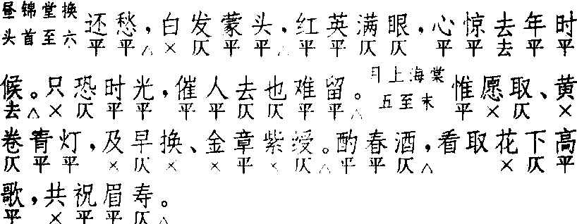 | 释义 | 锦堂月 锦堂月高明 《琵琶记》 ![]() 前腔 换头 ![]() 正格十句:4△,4,6△。4,6△。7,7△。3△,4,4△。换头格十一句:2△,4△,4,6△。4,6△。7,7△。3△,4,4△。换头格较正格多首句二字句。各句平仄较原曲有出入,可以互证,参考名篇,以求调协。少用衬字,多作偶句,是本曲特点。〔锦堂月〕为本套首牌,叠用四支或二支,后联〔醉翁子〕、〔侥侥令〕成套,用于婚娶、祝寿、庆赏等喜庆场面,大都多人轮唱,其乐融融,故词以整饬朗润为尚。《怀香记·毕姻封锡》只叠用四支,不接用〔醉翁子〕、〔侥侥令〕,极少见。小令兼用,只用正格。 ☚ 昼锦堂 醉翁子 ☛ |