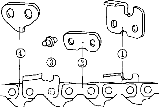 锯链组成图 类型 锯链按切削齿链片切削齿部分的结构分为直齿锯链和弯齿锯链两类。❶直齿锯链:切削齿有左右切齿、左右切刨齿和刨齿,分别担负端向切削、横向切削和过渡切削的任务。一般左右切齿与连接片制成一体,左右切刨齿和刨齿与传动链片制成一体。当锯口和木材纤维垂直时,直齿锯链有最好的锯切效率。当锯口和木材纤维之间的夹角变小时,其锯切效率就急剧下降。所以直齿锯链只用于单纯横截木材的锯切工作。 ❷弯齿锯链:只有左右钩形切削齿,一般都和连接片制成一体,每个切削齿都有水平刃、垂直刃和过渡刃。按过渡刃的形状和长短,钩形切削齿有圆形、半圆形、方形和半方形数种。各种钩形切削齿的链片上都有限制锯切深度的凸起部分,即限料器。钩形切削齿能同时完成端向切削、横向切削和过渡切削的任务。当锯口和木材纤维之间的夹角在一定范围内变化时,对其切削效率影响不大。在对木材进行横截或斜向锯切时都有较好的效果,所以又称万能锯链。 性能 决定锯链规格尺寸的主参数是节距,它是相邻3个链轴之间2个链轴距的平均值。在中国便携式链锯上使用的锯链的节距系列为:6.35毫米、8.25毫米、10.26毫米和15毫米。锉磨钩形切削齿的圆锉直径需和节距系列相适应,它们分别为3.8毫米、4.8毫米、5.5毫米和6.4毫米。 发展趋势 由于弯齿锯链的切削齿种类单一、锉磨容易、斜向锯切性能好、能自动限制最大进给量,所以在各国油锯上使用的都是这种锯链。为了减少锯链在锯切小径级树木和枝桠时的反弹伤害,美国俄勒冈、联邦德国斯蒂尔等公司制成了安全型弯齿锯链。这些锯链的链片上设有一小凸起,有的是在切削齿链片的限料器侧边,有的是在传动链片顶部,有的是在连接片顶部。这些小凸起在锯链运行过程中能阻止枝桠细条嵌入各链片的连接处,从而防止可能造成的反弹。为了更好地解决锯链锉磨机械化问题,美国俄勒冈公司在1966年就研制出一种动力锉磨式锯链。这种锯链的切削齿顶切刃是倾斜的,锉磨时,安装在链轮一侧的弧形磨可靠近锯链,靠锯链本身的运行动力,对切削齿和限料器同时进行锉磨。这种锯链不但锉磨快,而且切削齿和限料器锉磨精确一致,是锯切平稳、生产率高的一种现代锯链。在从事横截原木的电动链锯中,仍宜采用直齿锯链。 |