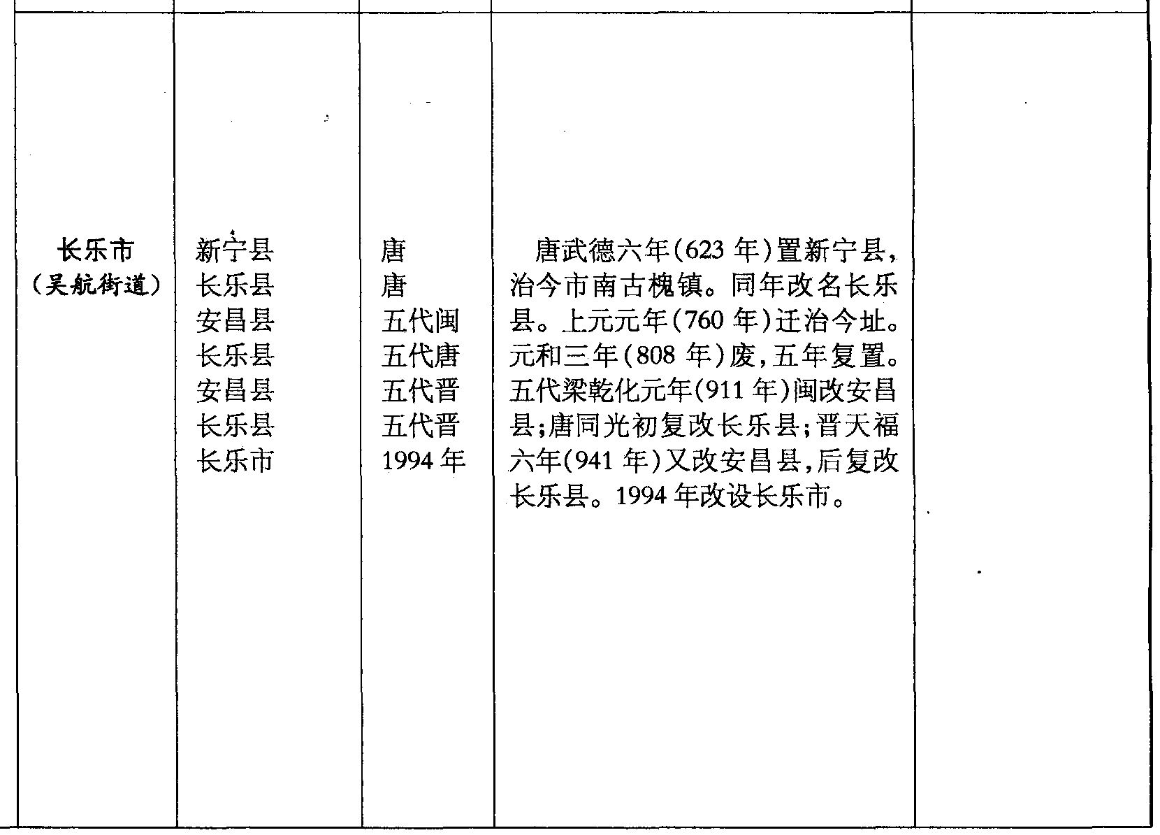 长乐市(吴航街道)新宁县长乐县安昌县长乐县安昌县长乐县长乐市唐唐五代闽五代唐五代晋五代晋1994年唐武德六年(623年)置新宁县,治今市南古槐镇。同年改名长乐县。上元元年(760年)迁治今址。元和三年(808年)废,五年复置。五代梁乾化元年(911年)闽改安昌县;唐同光初复改长乐县;晋天福六年(941年)又改安昌县,后复改长乐县。1994年改设长乐市。