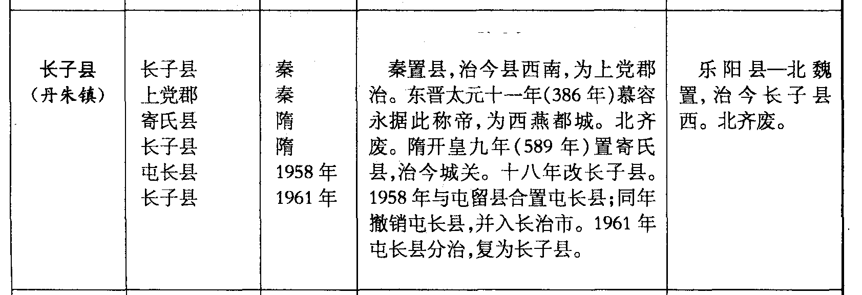 长子县(丹朱镇)长子县上党郡寄氏县长子县屯长县长子县秦秦隋隋1958年1961年秦置县,治今县西南,为上党郡治。东晋太元十一年(386年)慕容永据此称帝,为西燕都城。北齐废。隋开皇九年(589年)置寄氏县,治今城关。十八年改长子县。1958年与屯留县合置屯长县;同年撤销屯长县,并入长治市。1961年屯长县分治,复为长子县。乐阳县—北魏置,治今长子县西。北齐废。