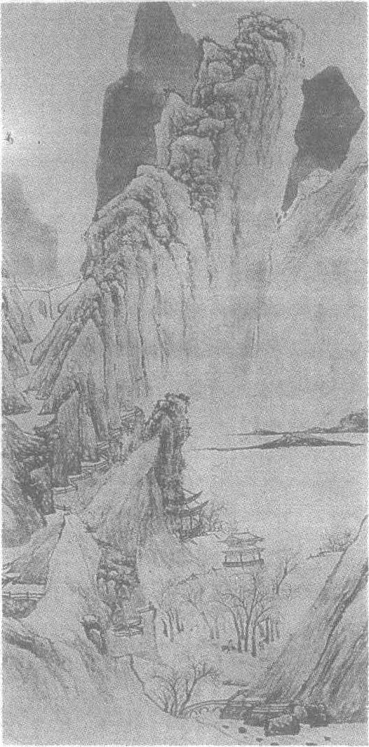 明。陆师道绘。纸本水墨。纵117.5厘米,横30厘米。北京故宫博物院藏。陆师道(公元1517—1580年),字子传,号元洲,更号五湖,江苏苏州人。嘉靖十七年(公元1538年)进士,授工部主事,官至尚书少卿。30岁以后拜文徵明为师,工诗文、书画,山水在学文徵明的同时,还上探倪瓒、赵孟頫。山水风格淡远清丽,淡远者类似倪瓒,精丽者近似赵孟頫。笔墨运用有自己的特色,兼工小楷、古篆。著《左史子汉镌》、《五湖集》。此图绘溪山胜景。远处山势陡险,山峦层叠。峡谷间,拱挢横架,盘山小道蜿蜒曲折,护路拦杆清旷可见。飞瀑如练,平湖清幽。湖旁亭台楼阁秀丽端庄,坡岸处有行旅游骑。近景,河流湍急,三孔桥连接两岸,沿河岸边,柳树成荫,茅舍隐现。一舟载有一人,一人正在奋力划桨。此图意境疏旷,秀润明爽。笔法吸收元人画法淡远精细。山石皴染兼有文派风格。左上自书七言绝句,款署:“师道写。”下钤〈陆子传〉、〈陆师道印〉二方印。又有王榖祥、彭年、文彭、文嘉等题诗和鉴藏诸印。
